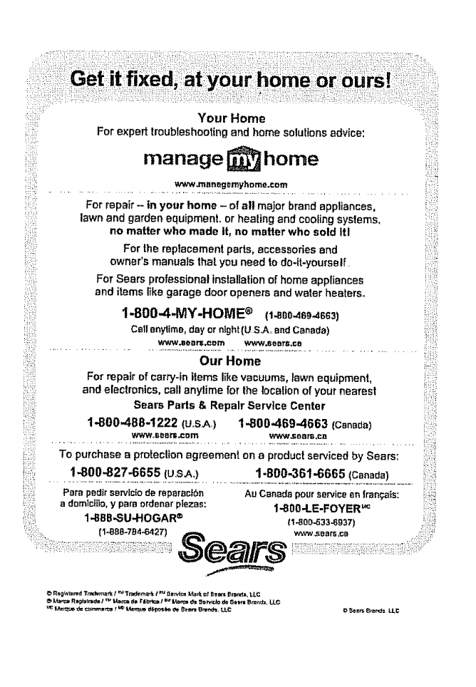 Sears Repair Parts Phone Numbers .........................................................................Back Cover