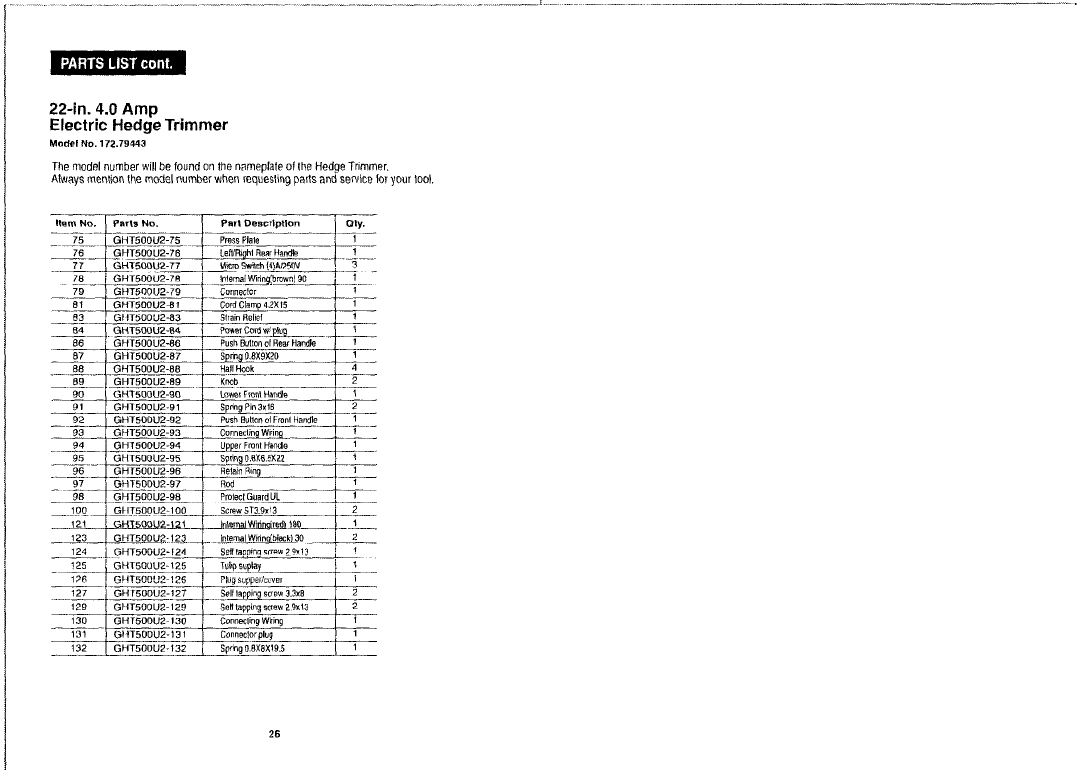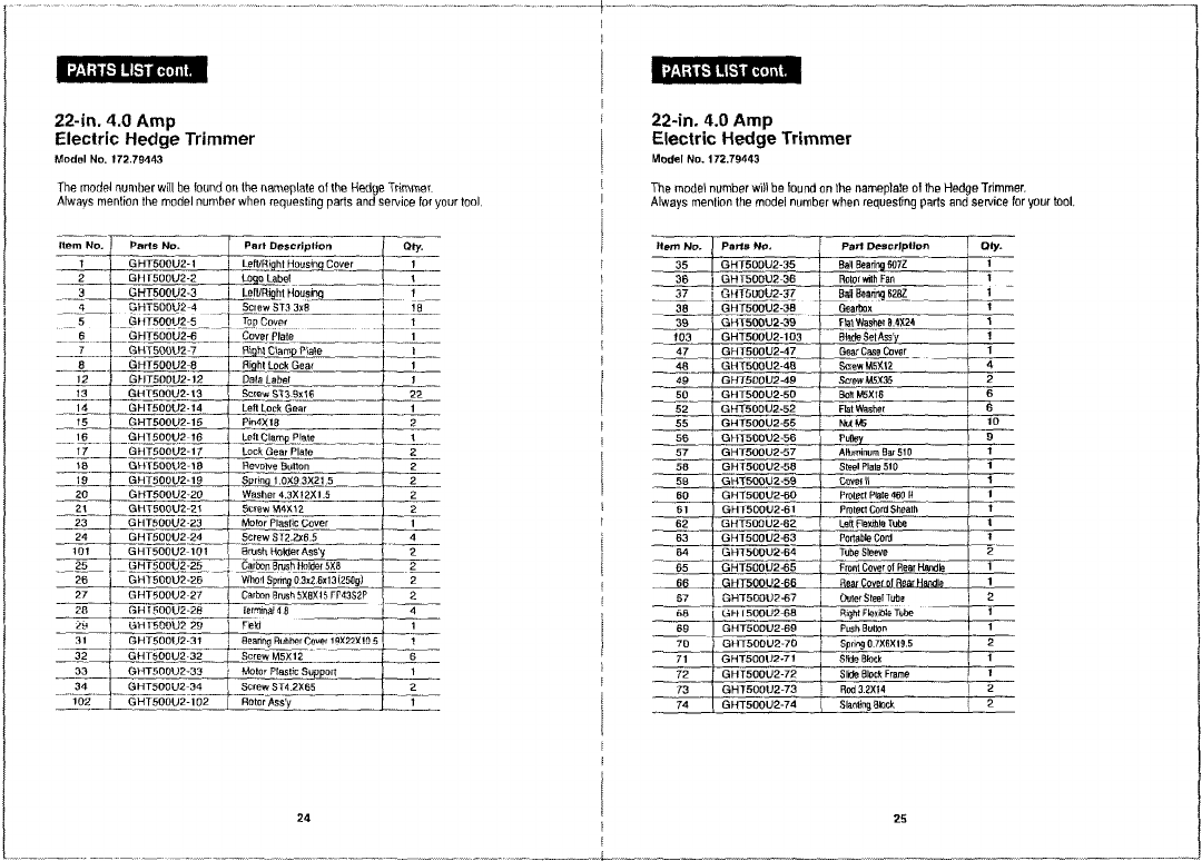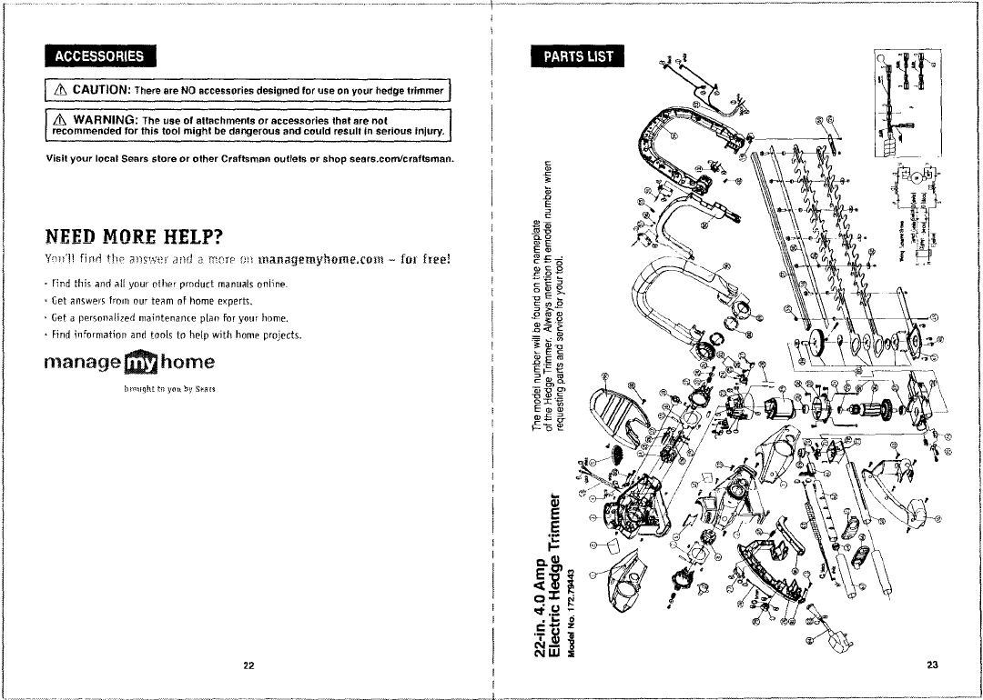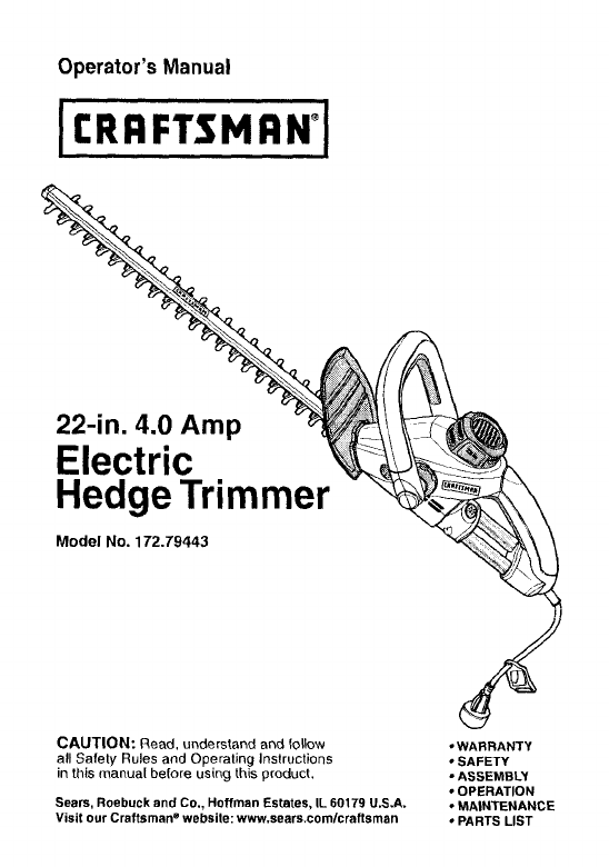 User Manual: Craftsman 17279443 17279443 CRAFTSMAN HEDGE TRIMMER - Manuals and Guides View the owners manual for your CRAFTSMAN HEDGE TRIMMER #17279443. Home:Lawn & Garden Parts:Craftsman Parts:Craftsman HEDGE TRIMMER Manual