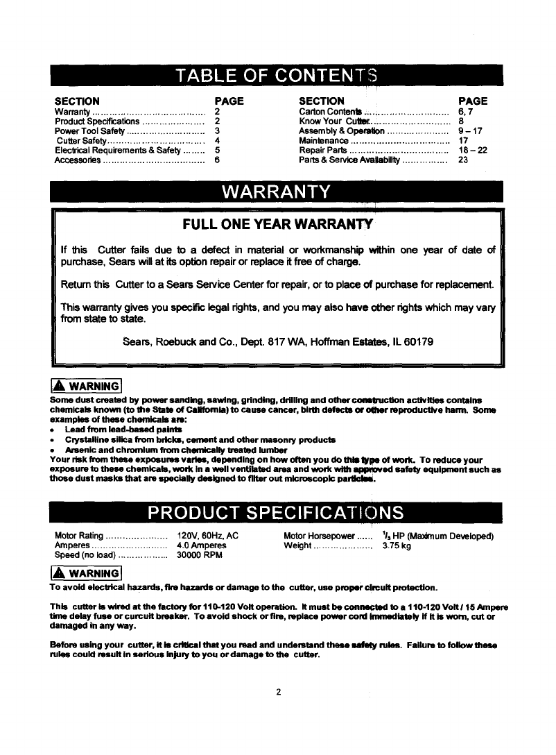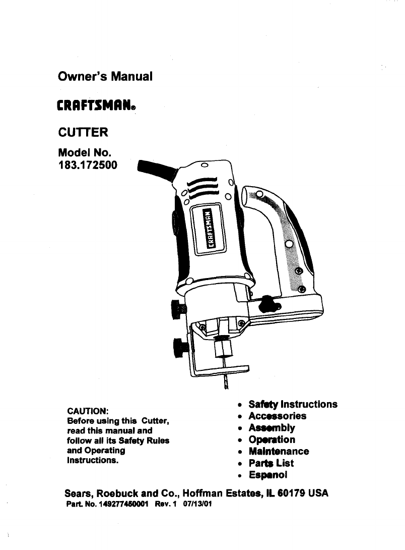 Returnthis Cutter to a Sears Service Center for repair,or to place of purchase for replacement.