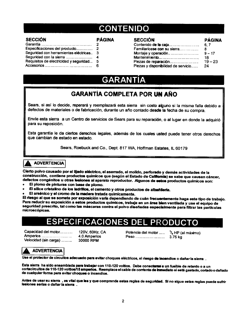 Motor Rating ...................... 120V, 60Hz, AC Motor Horsepower ...... tl3 HP (Ma_mum Developed)
