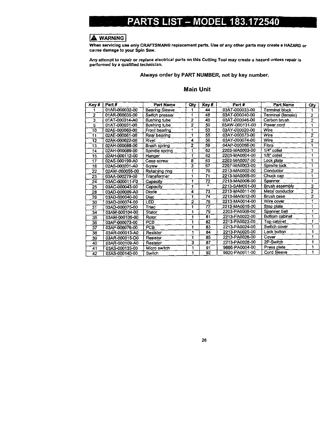 Key # Part # Part Name Qty Key # Part #