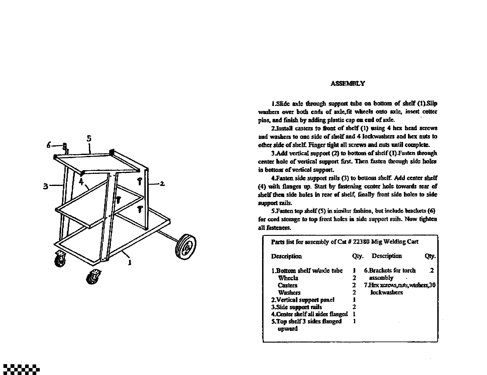 Parts list for mscmbly of Cat # 22380 Mig Welding Cart
