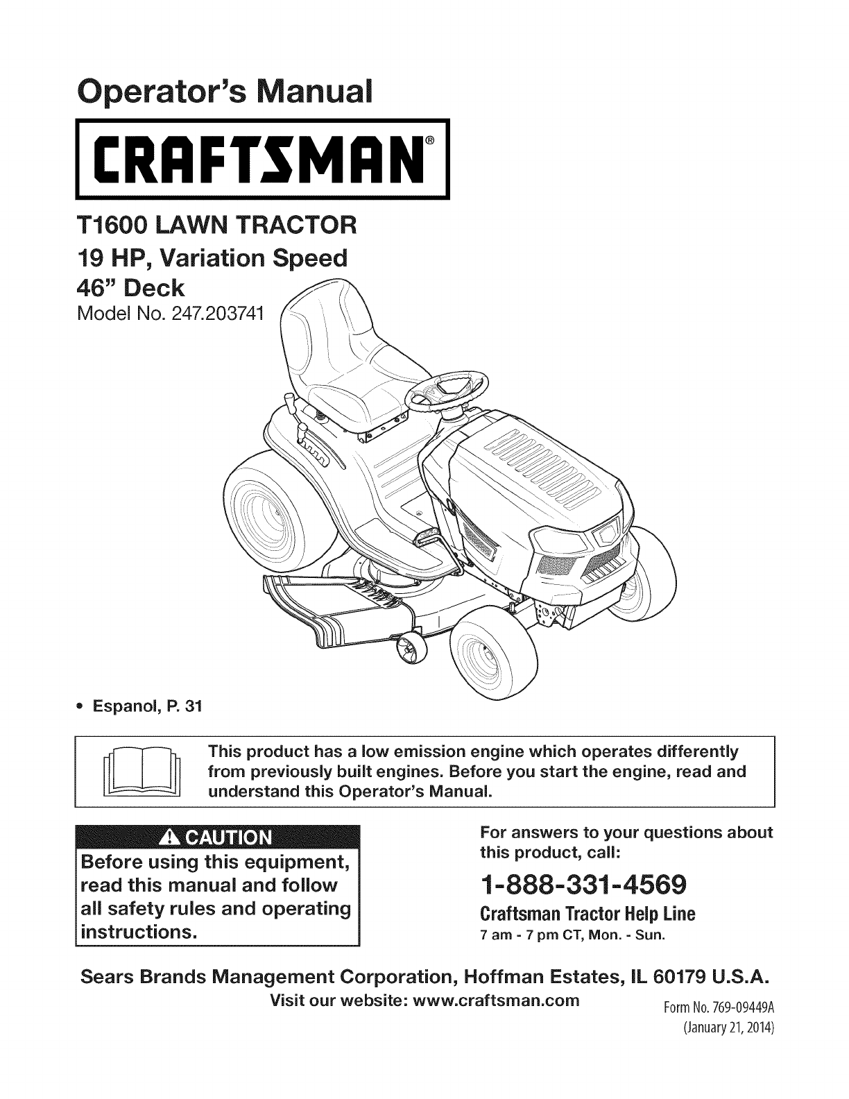 User Manual: Craftsman 247203741 247203741 CRAFTSMAN TRACTOR - Manuals and Guides View the owners manual for your CRAFTSMAN TRACTOR #247203741. Home:Lawn & Garden Parts:Craftsman Parts:Craftsman TRACTOR Manual