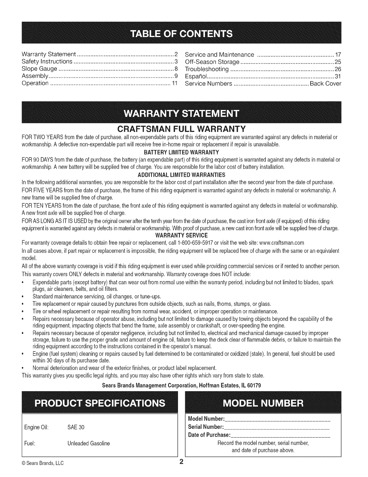FORTENYEARSfromthe dateof purchase,the frontaxleof thisridingequipmentiswarrantedagainstany defectsin materialorworkmanship.
