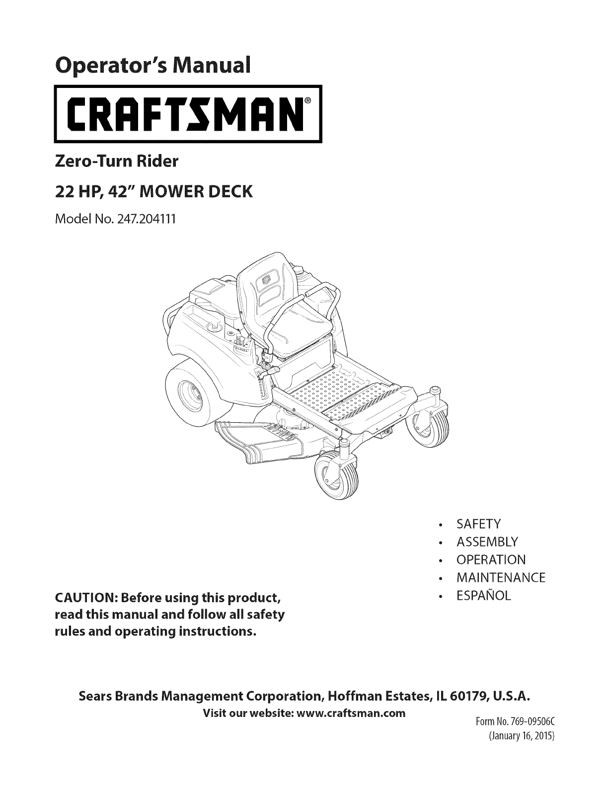 User Manual: Craftsman 247204111 247204111 CRAFTSMAN ZERO TURN RIDING MOWER - Manuals and Guides View the owners manual for your CRAFTSMAN ZERO TURN RIDING MOWER #247204111. Home:Lawn & Garden Parts:Craftsman Parts:Craftsman ZERO TURN RIDING MOWER Manual