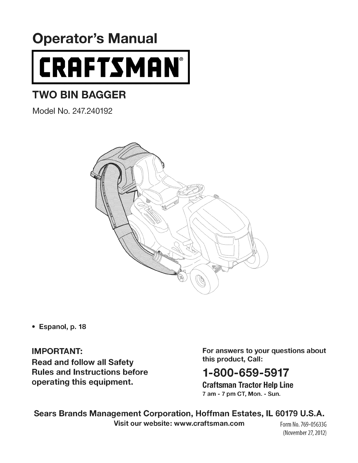 User Manual: Craftsman 247240192 247240192 CRAFTSMAN TWO BIN BAGGER - Manuals and Guides View the owners manual for your CRAFTSMAN TWO BIN BAGGER #247240192. Home:Lawn & Garden Parts:Craftsman Parts:Craftsman TWO BIN BAGGER Manual
