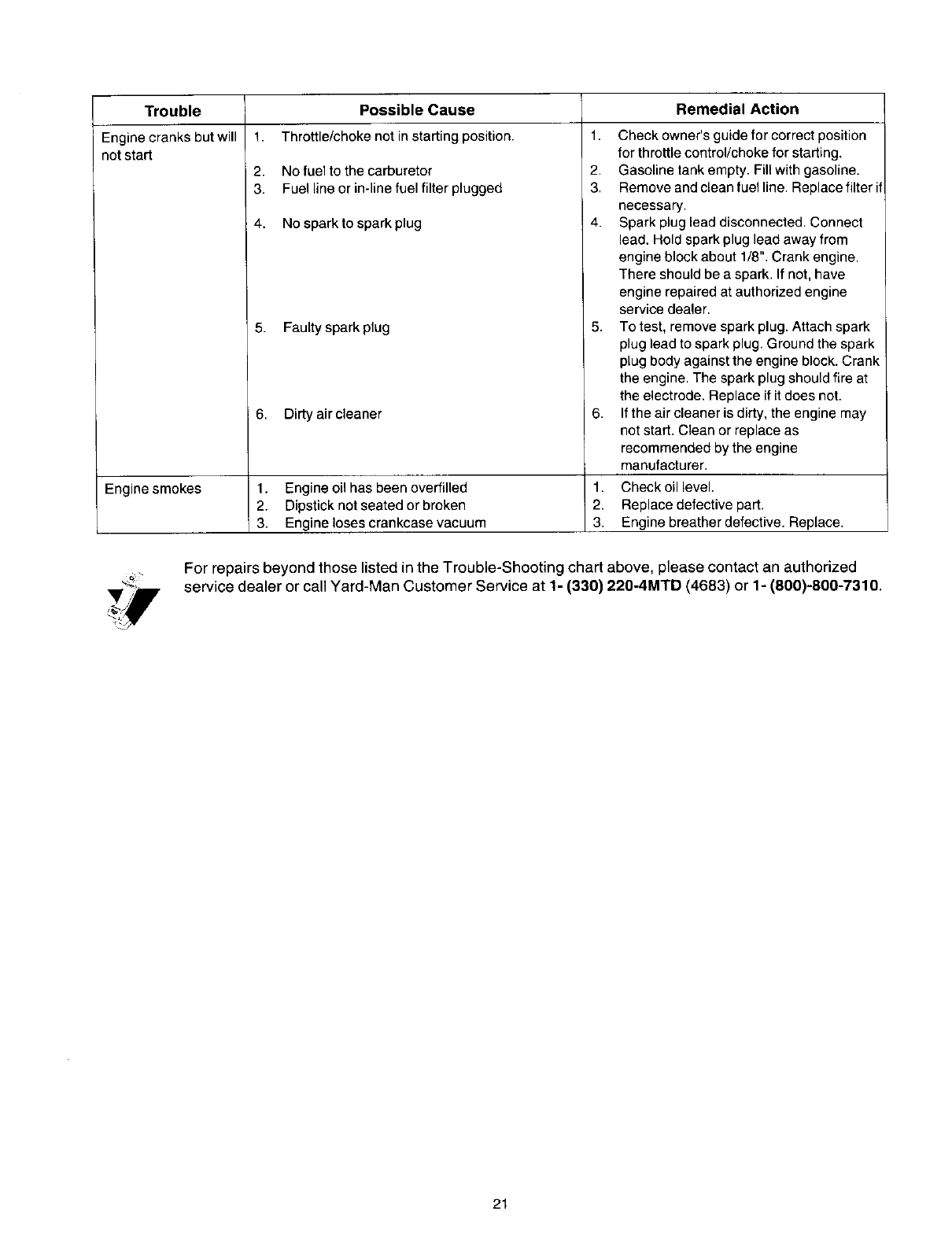 contact the Customer Service Department of MTD PROD-