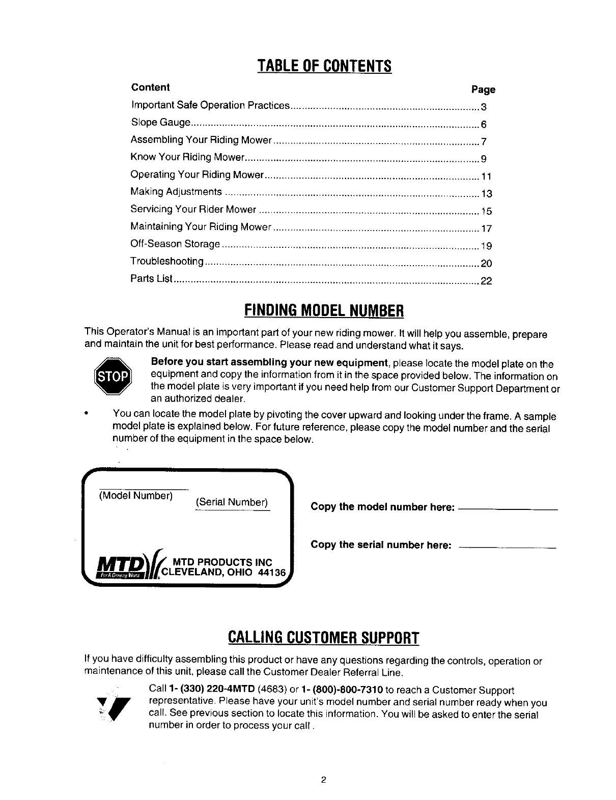 Call 1- (330) 220-4MTD (4683) or 1- (800)-800-7310 to reach a Customer Support