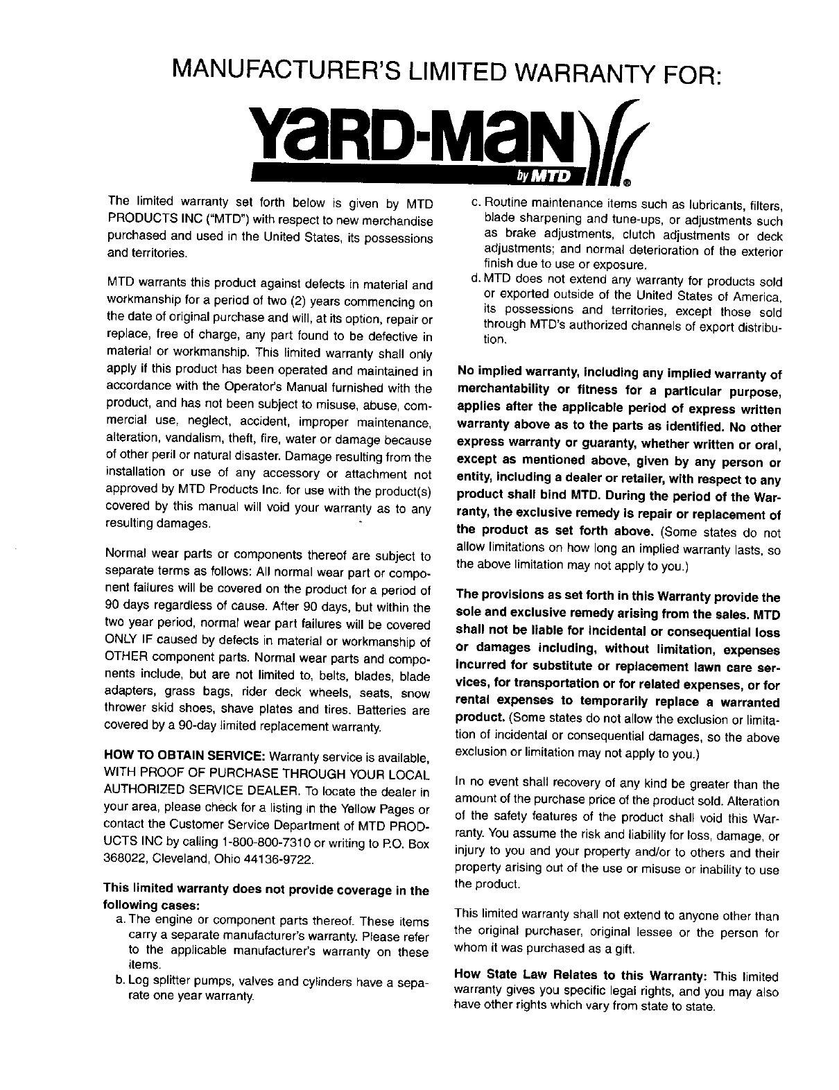 MTD warrants this product against defects in material and