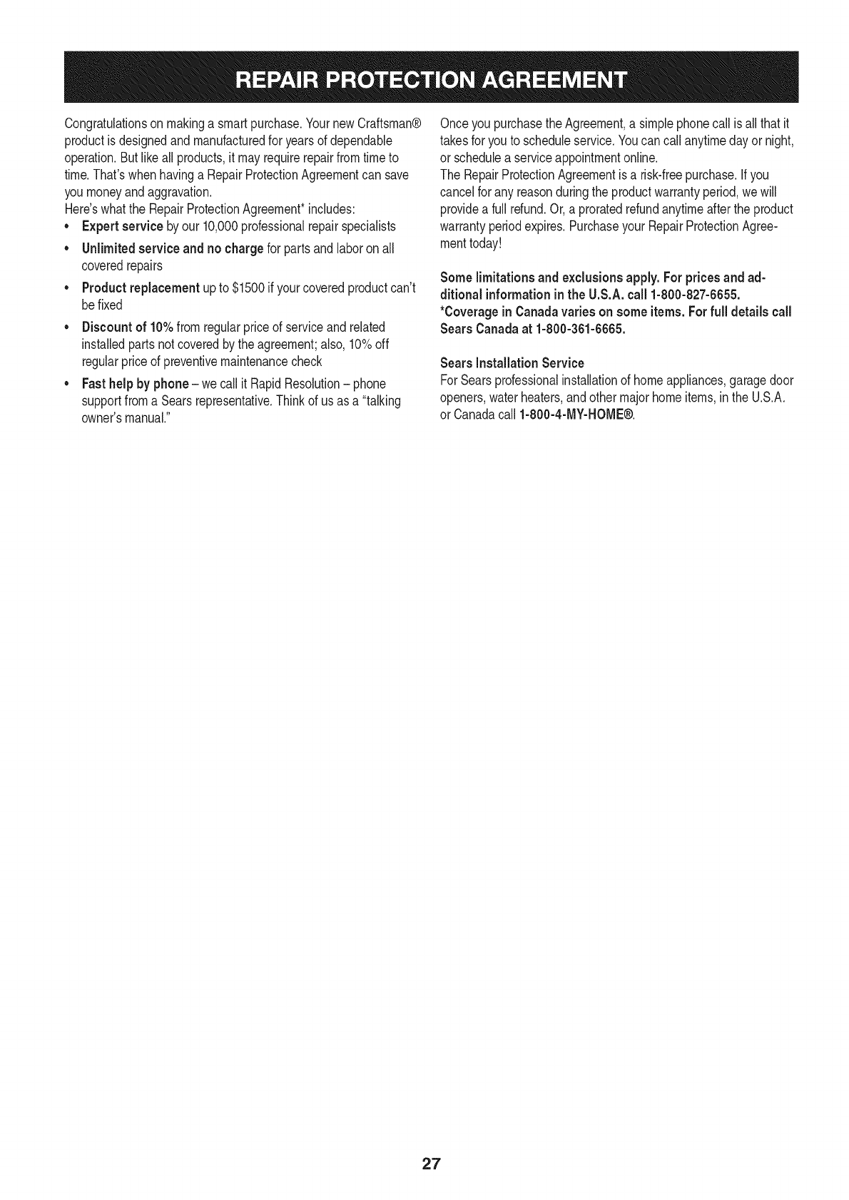 store,Parts& RepairServiceCenter,or otherCraftsmanoutletin the UnitedStatesfor free repair(or replacementif repairprovesimpos-