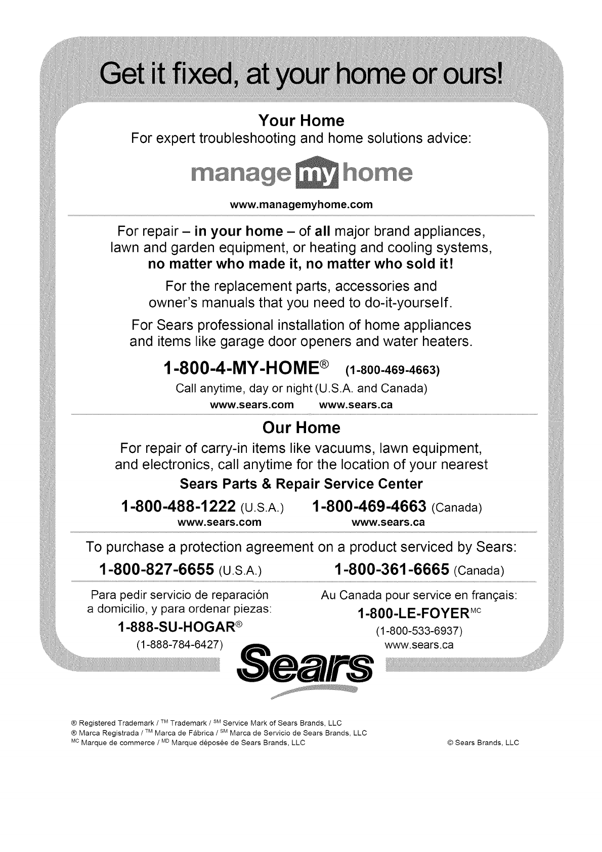 ® Marca Registrada /Marca de F&brica /sM Marca de Servicio de Sears Brands, LLC