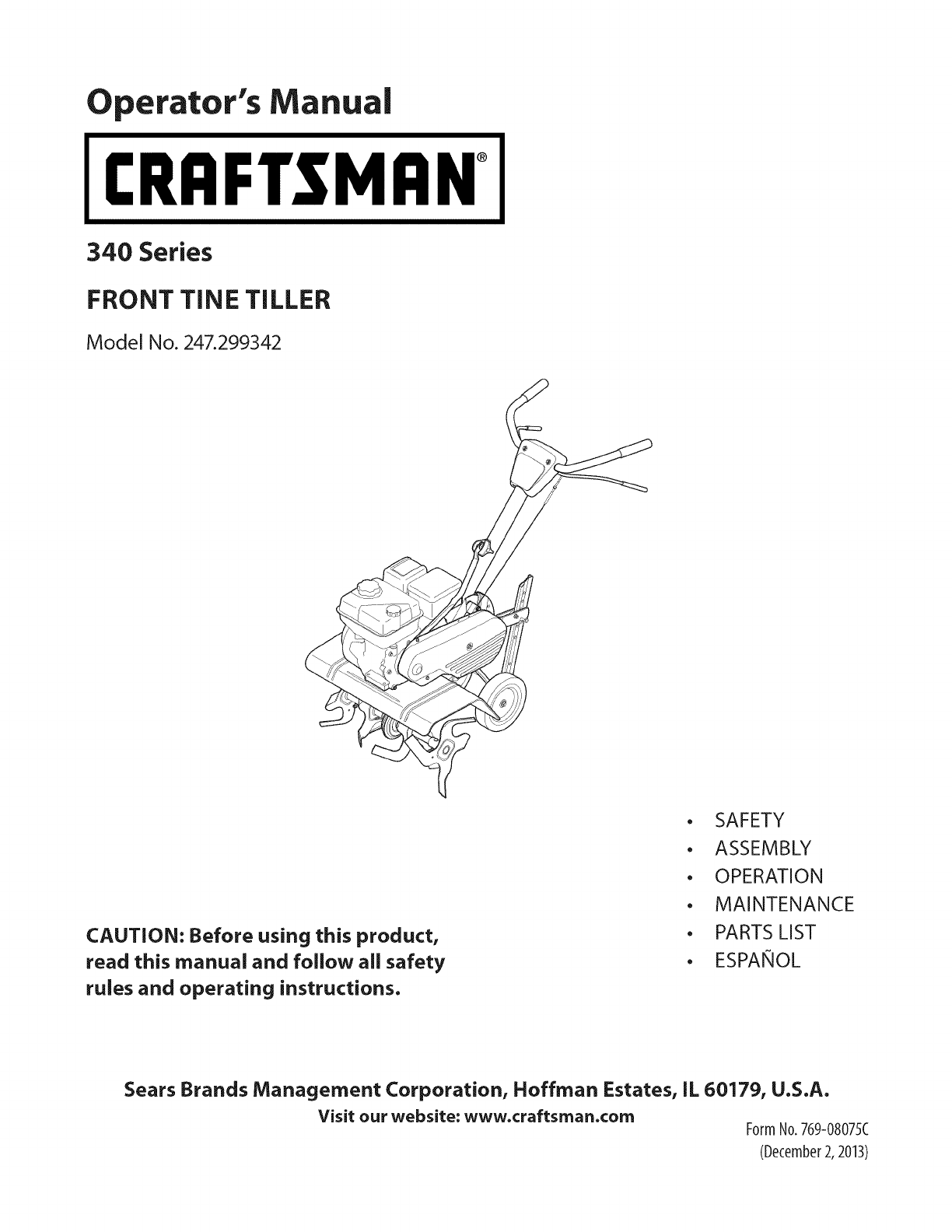 User Manual: Craftsman 247299342 247299342 CRAFTSMAN FRONT TINE TILLER - Manuals and Guides View the owners manual for your CRAFTSMAN FRONT TINE TILLER #247299342. Home:Lawn & Garden Parts:Craftsman Parts:Craftsman FRONT TINE TILLER Manual