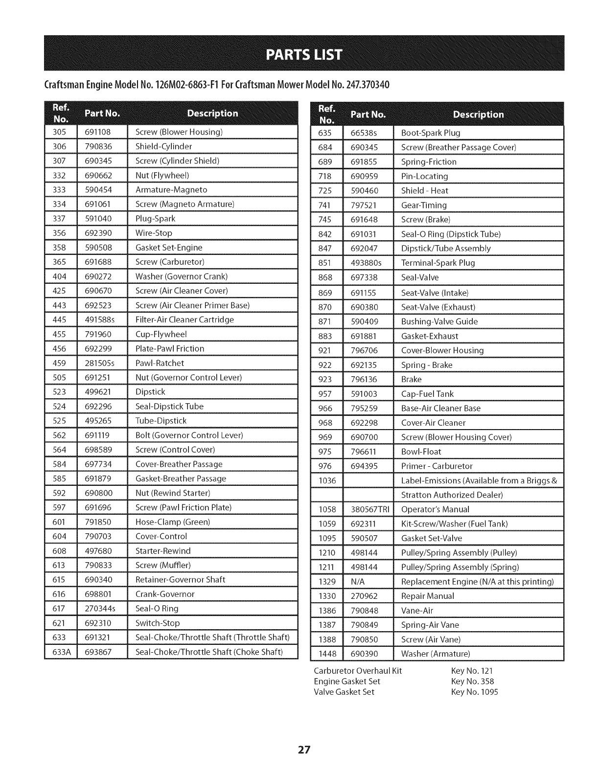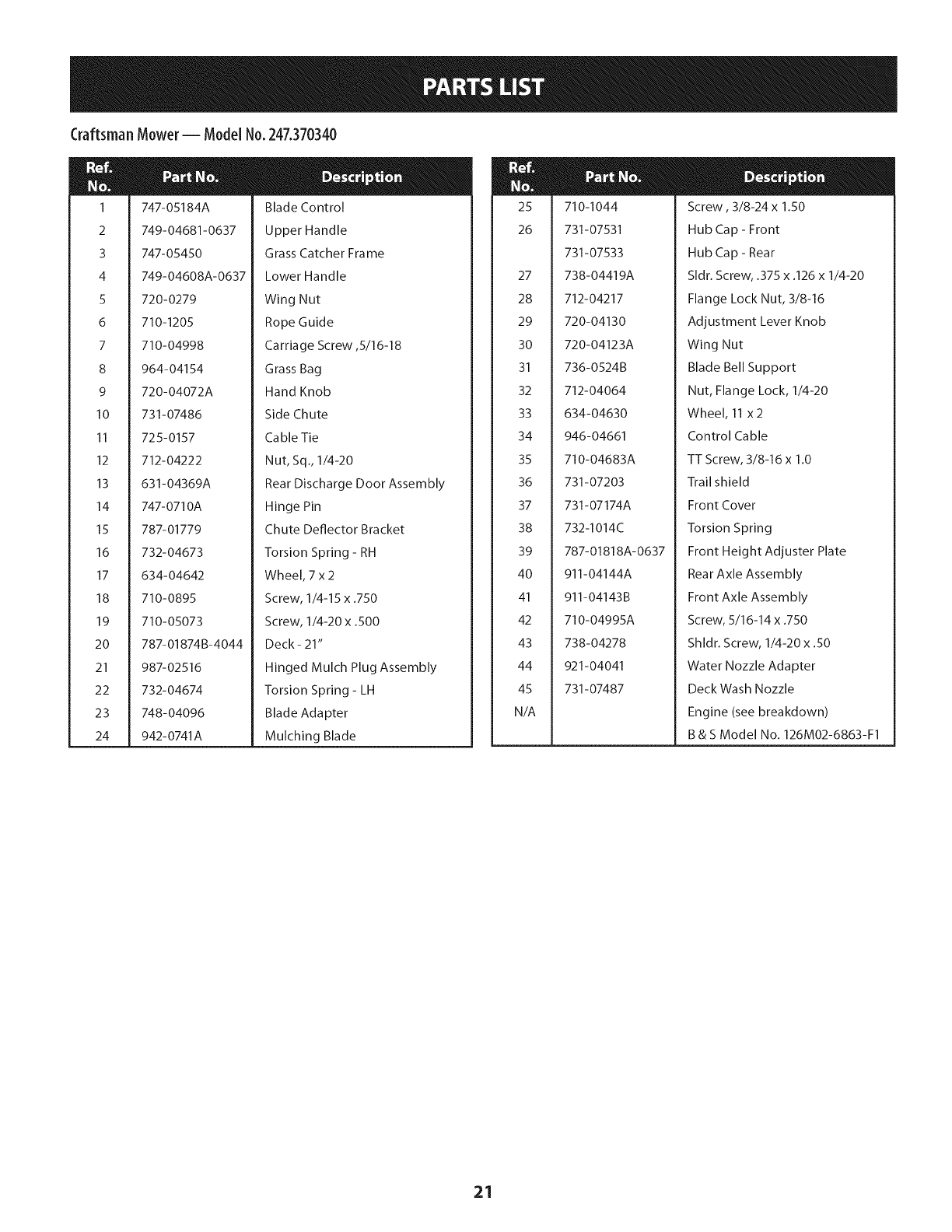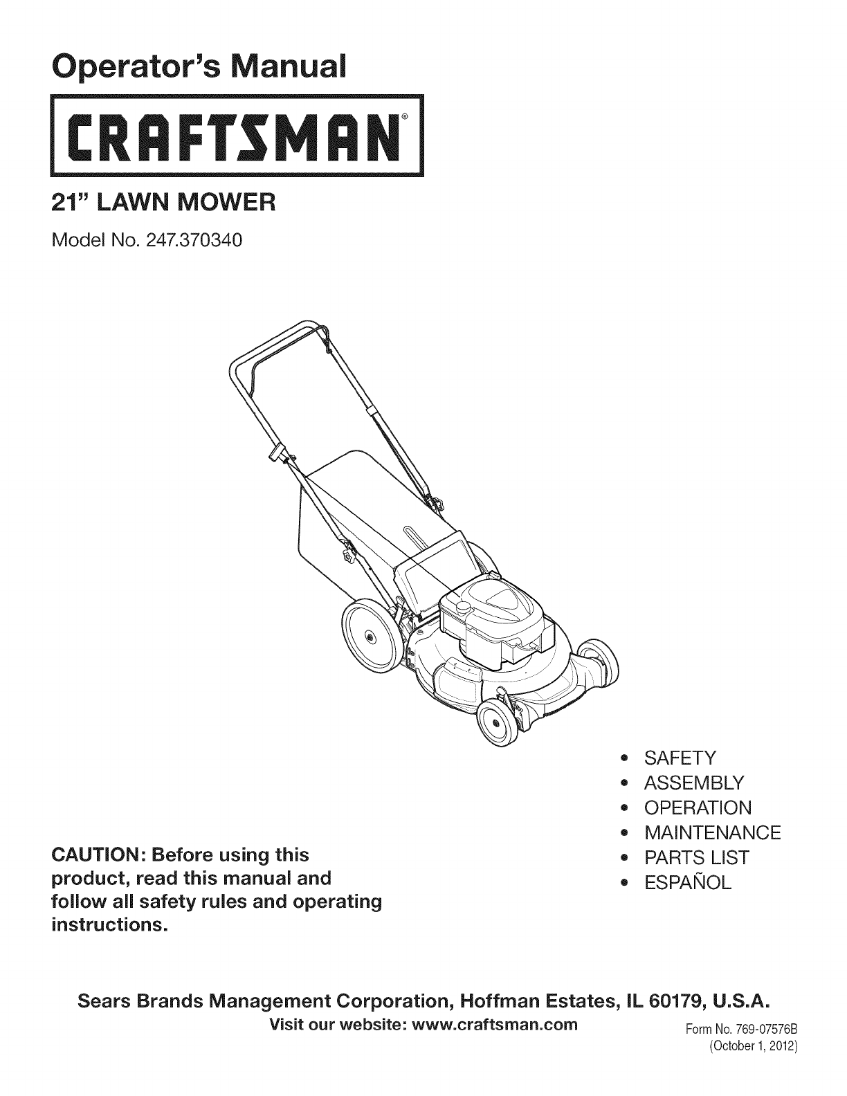User Manual: Craftsman 247370340 247370340 CRAFTSMAN MOWER - Manuals and Guides View the owners manual for your CRAFTSMAN MOWER #247370340. Home:Lawn & Garden Parts:Craftsman Parts:Craftsman MOWER Manual