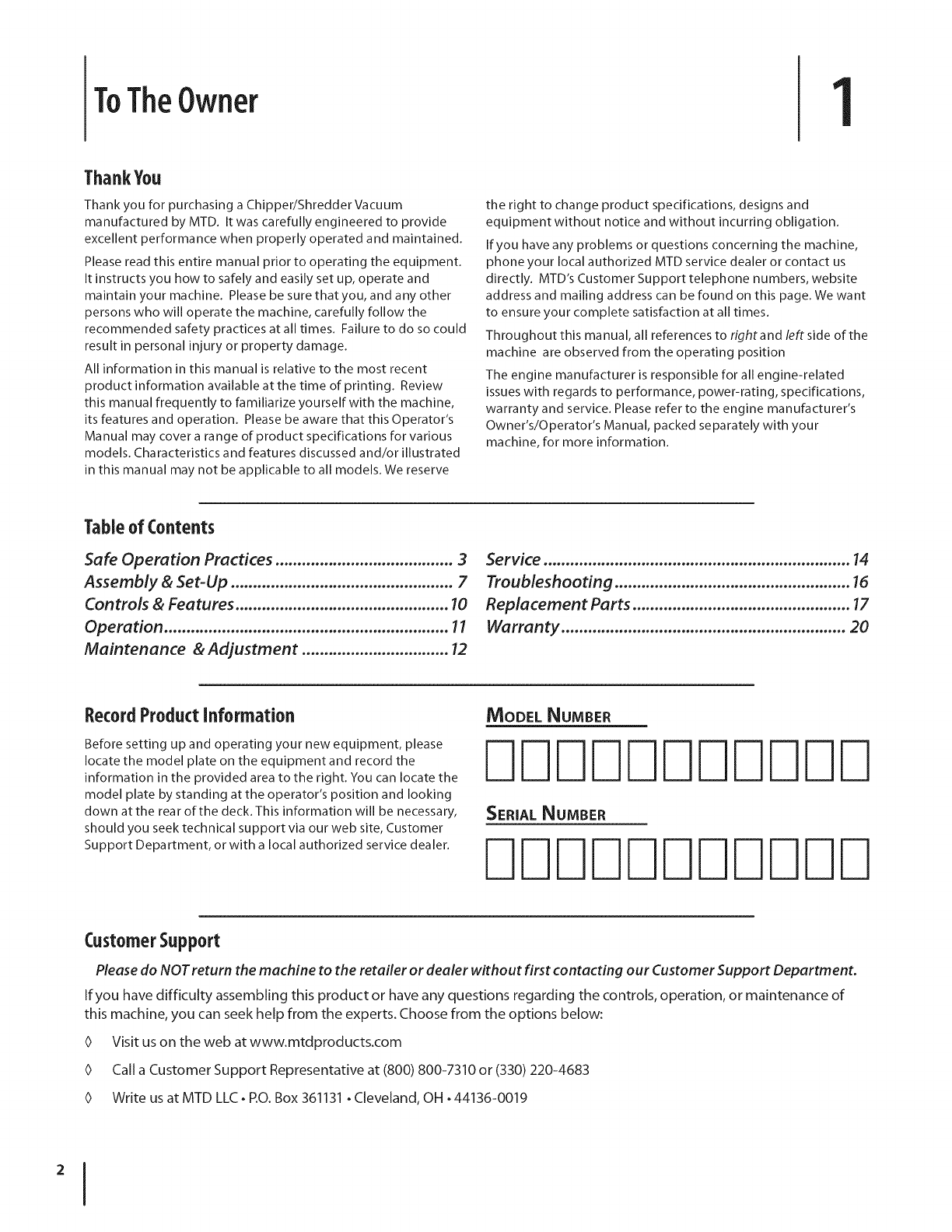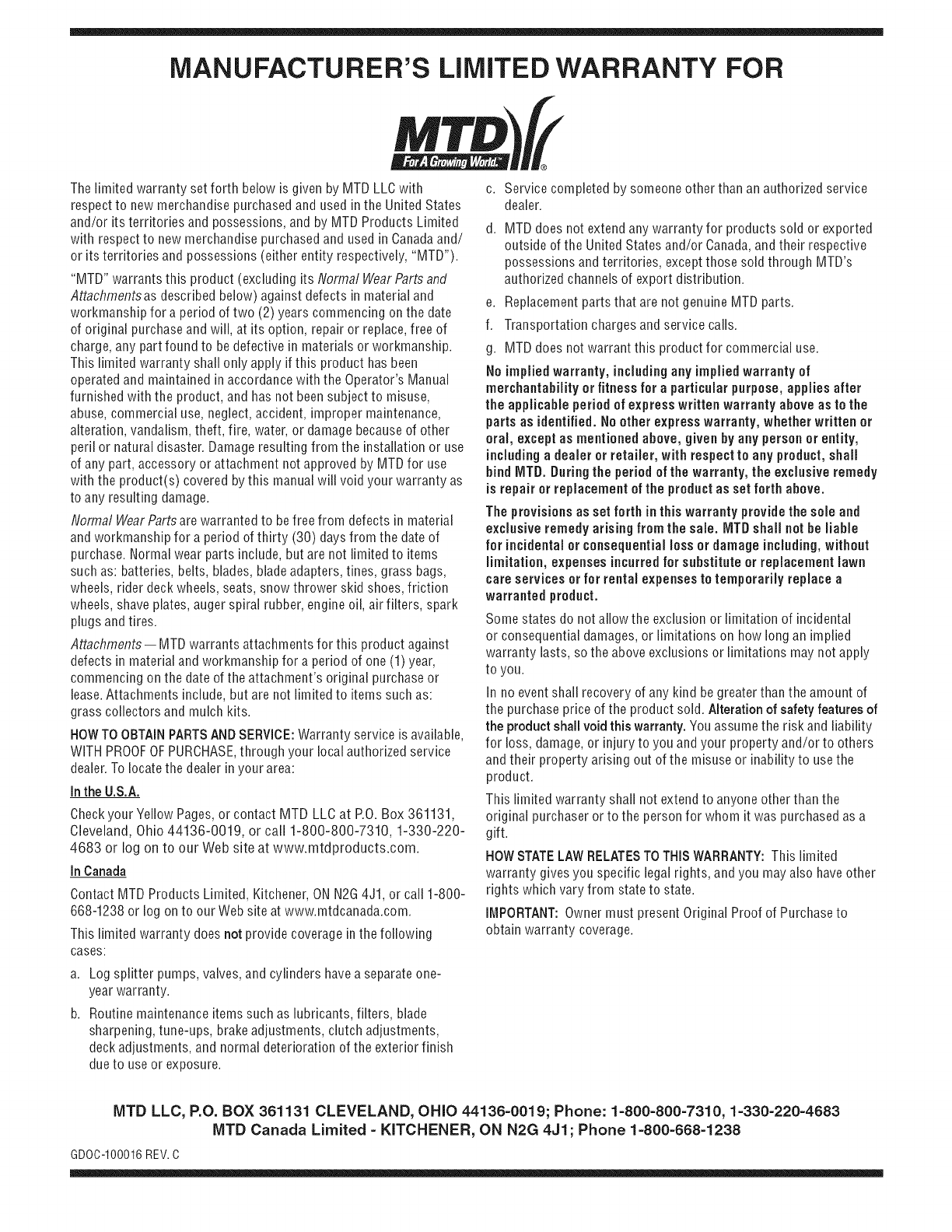 MTD LLC, P.O. BOX 361131 CLEVELAND, OHIO 44136-0019; Phone: 1=800=800=7310, 1=330=220-4683