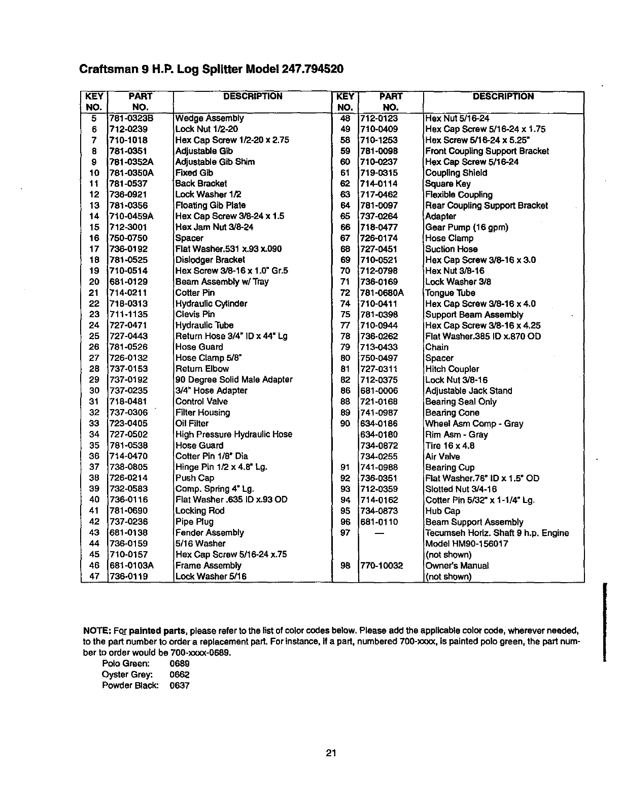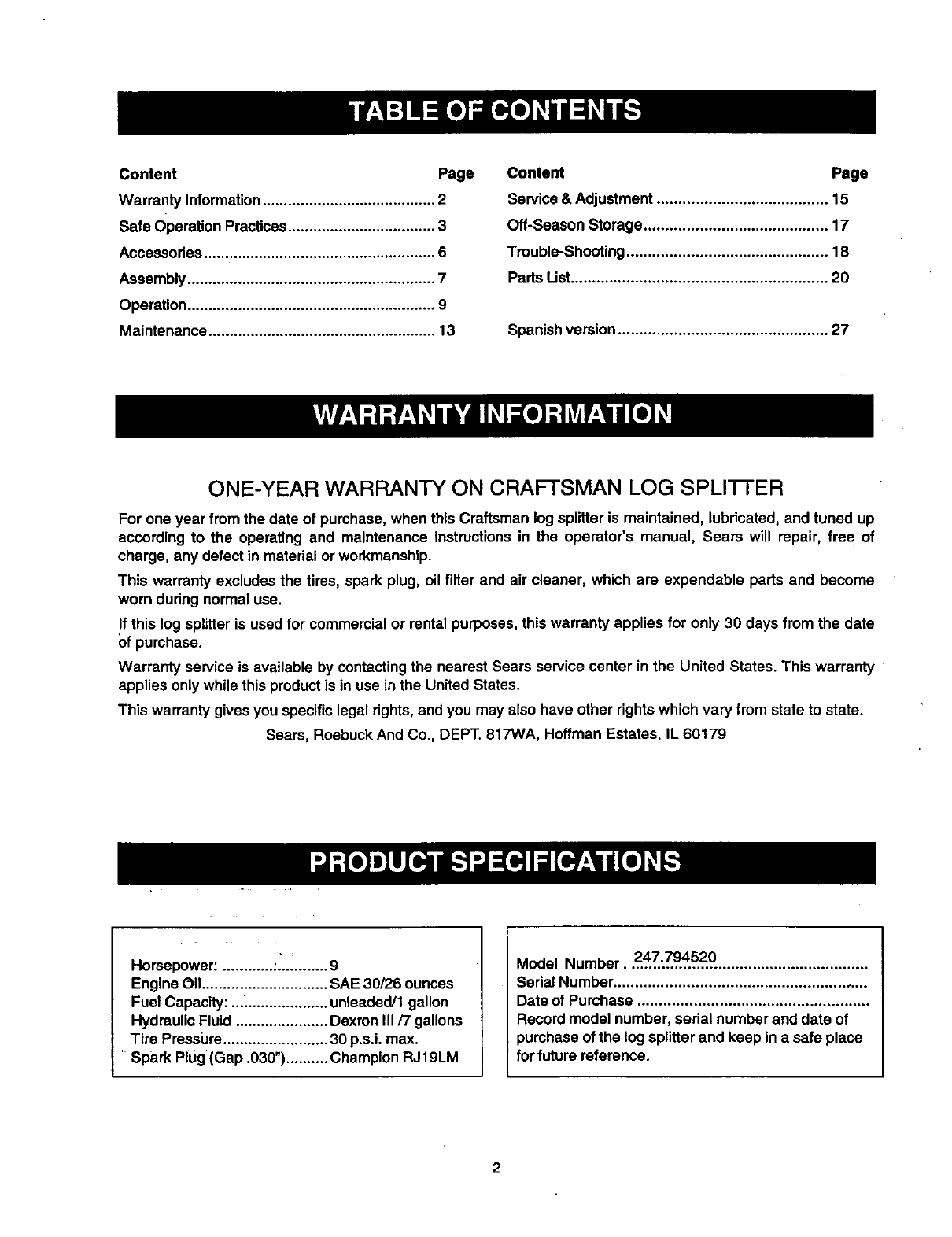 User Manual: Craftsman 247794520 247794520 CRAFTSMAN Log Splitter - Manuals and Guides View the owners manual for your CRAFTSMAN Log Splitter #247794520. Home:Lawn & Garden Parts:Craftsman Parts:Craftsman Log Splitter Manual