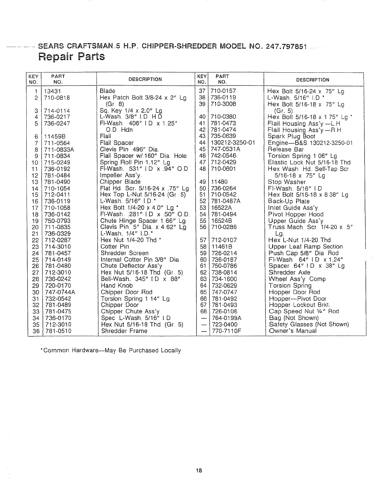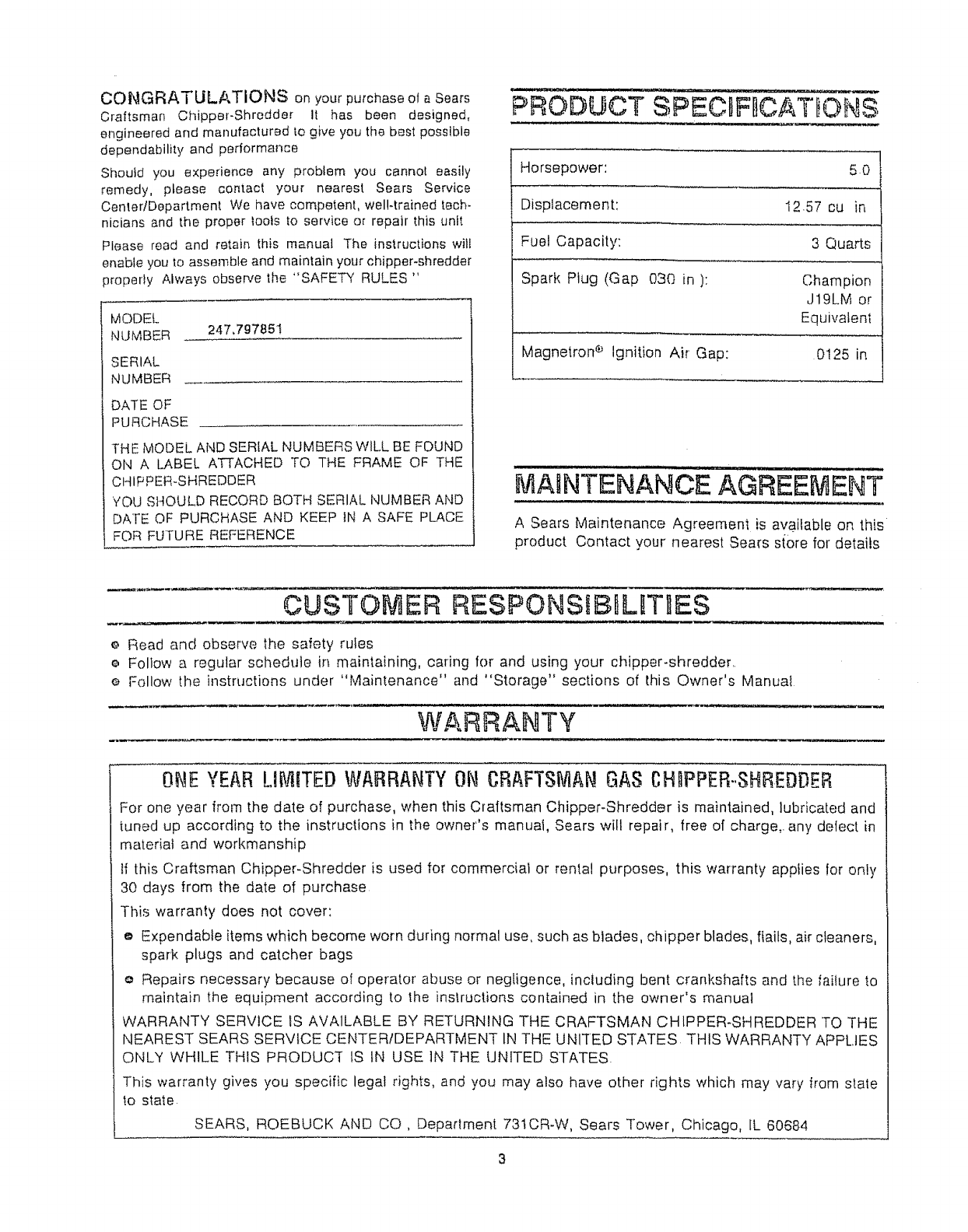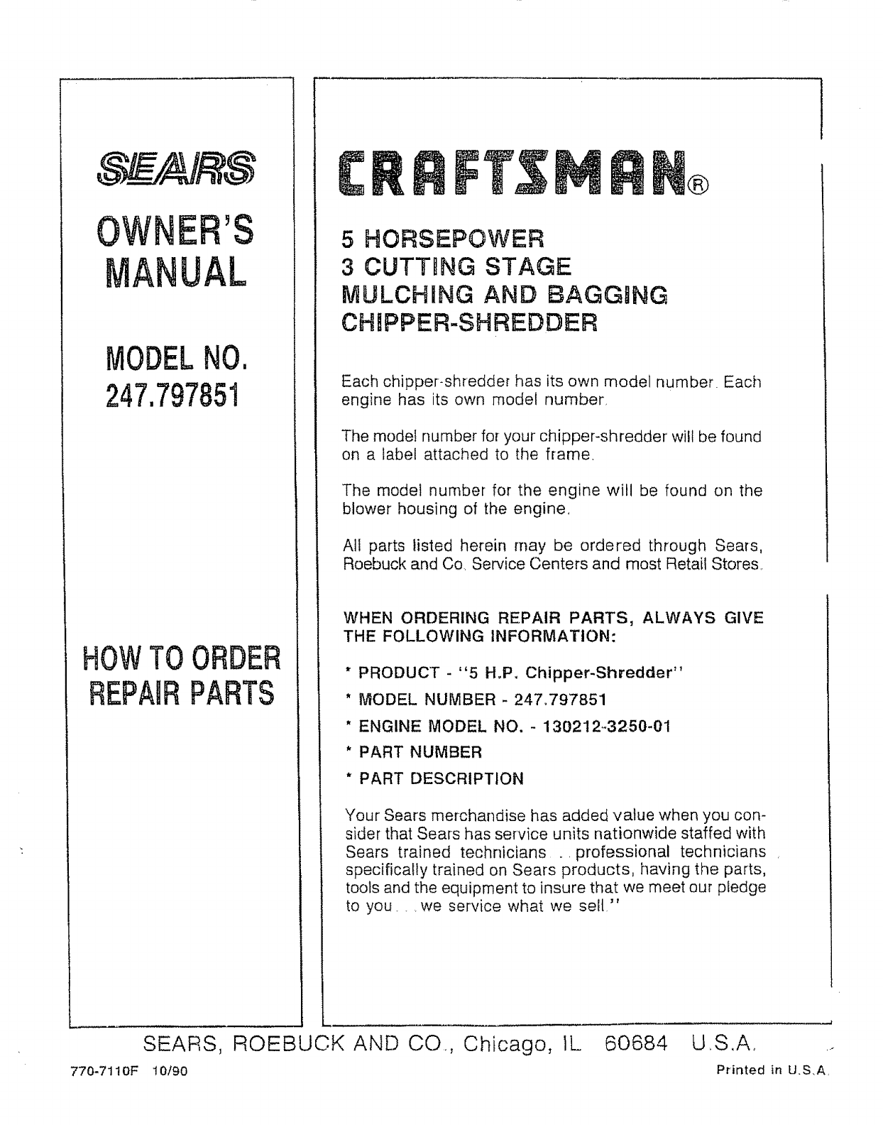User Manual: Craftsman 247797851 247797851 CRAFTSMAN CHIPPER SHREDDER - Manuals and Guides View the owners manual for your CRAFTSMAN CHIPPER SHREDDER #247797851. Home:Lawn & Garden Parts:Craftsman Parts:Craftsman CHIPPER SHREDDER Manual