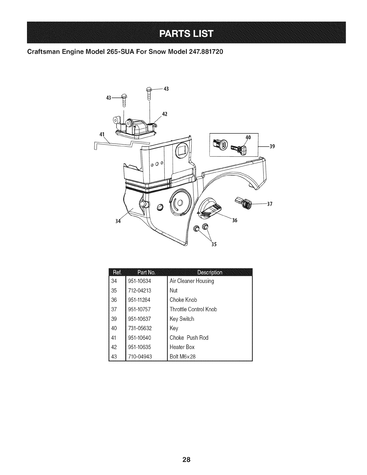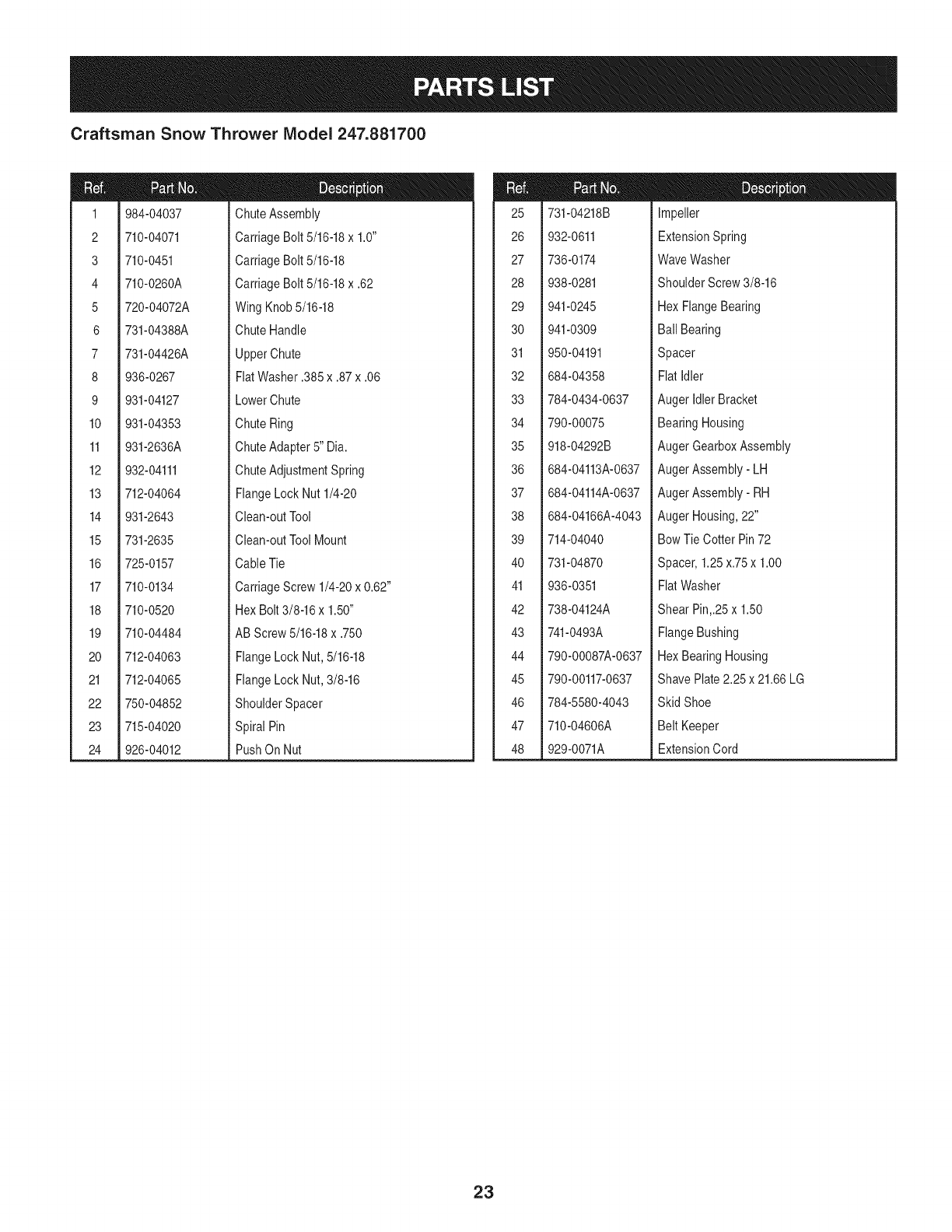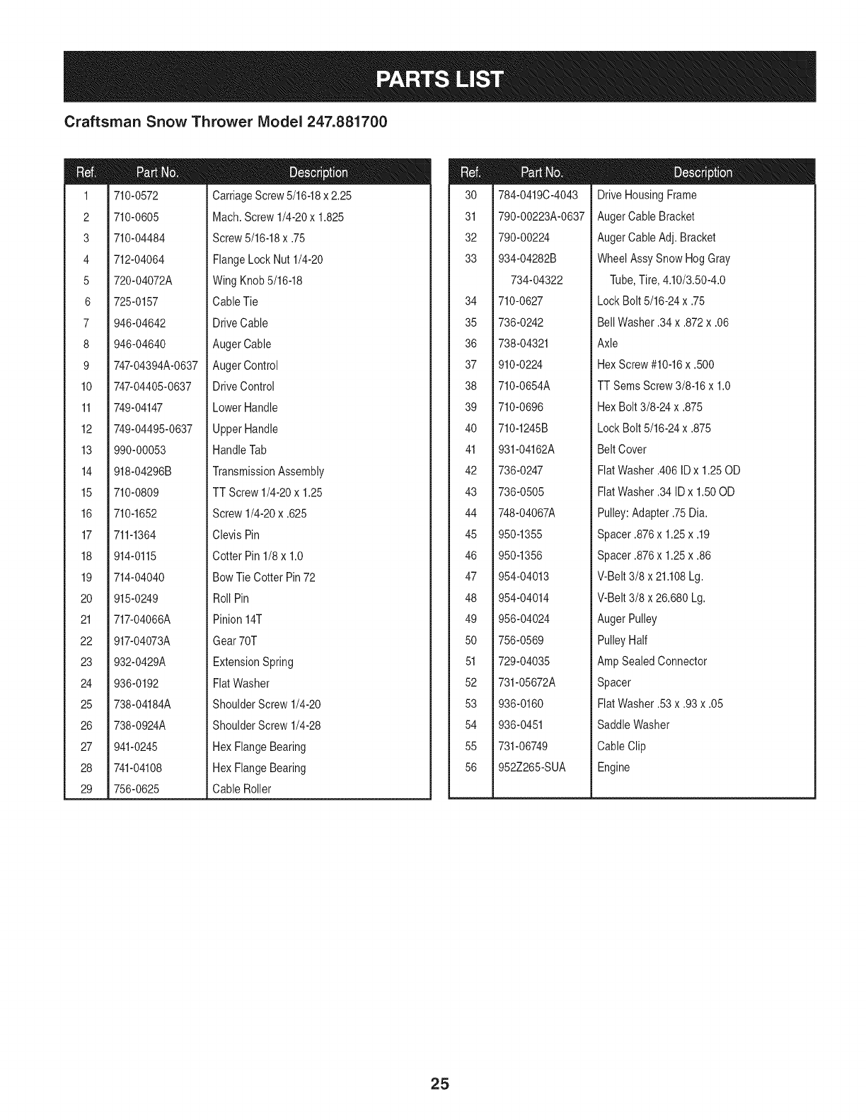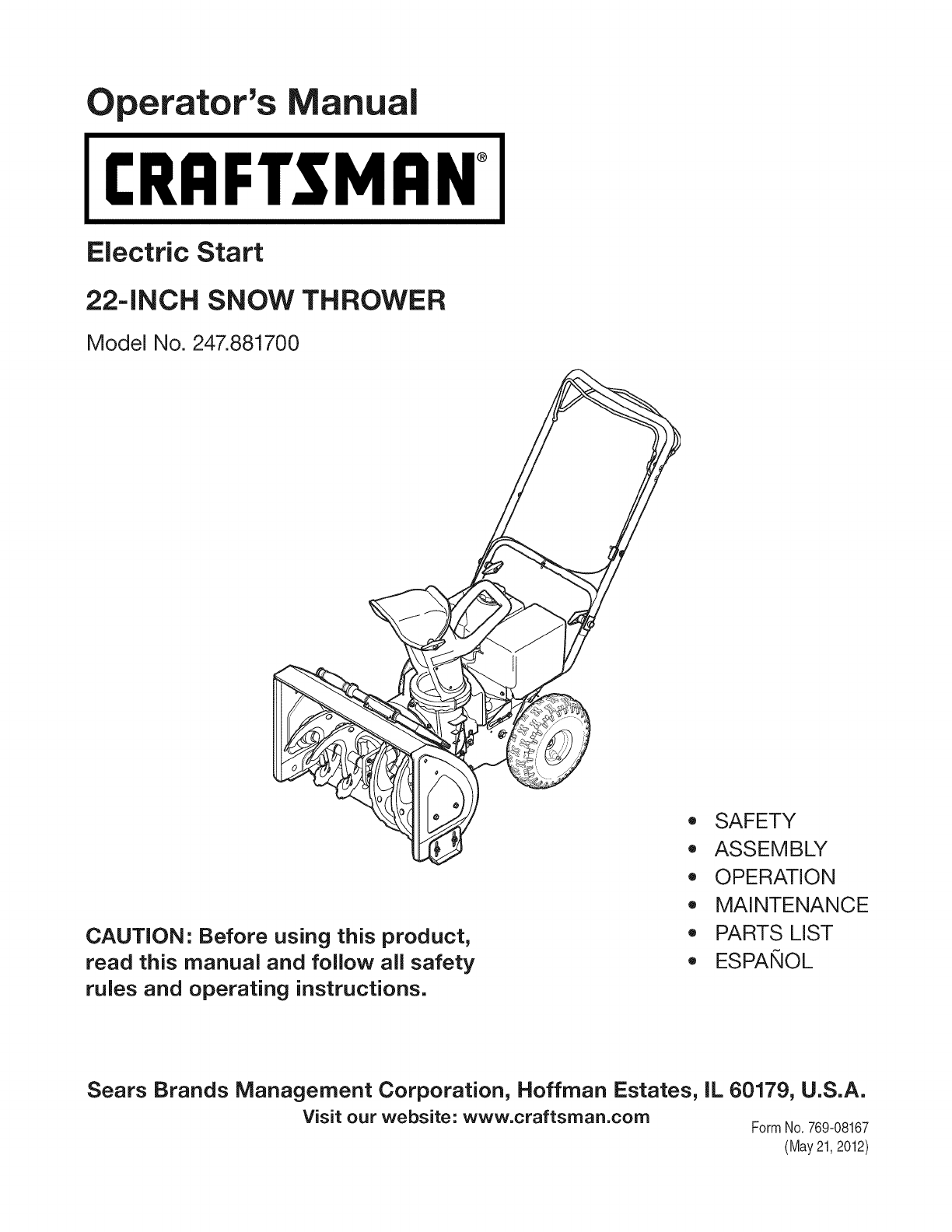 User Manual: Craftsman 247881700 247881700 CRAFTSMAN SNOW THROWER - Manuals and Guides View the owners manual for your CRAFTSMAN SNOW THROWER #247881700. Home:Lawn & Garden Parts:Craftsman Parts:Craftsman SNOW THROWER Manual