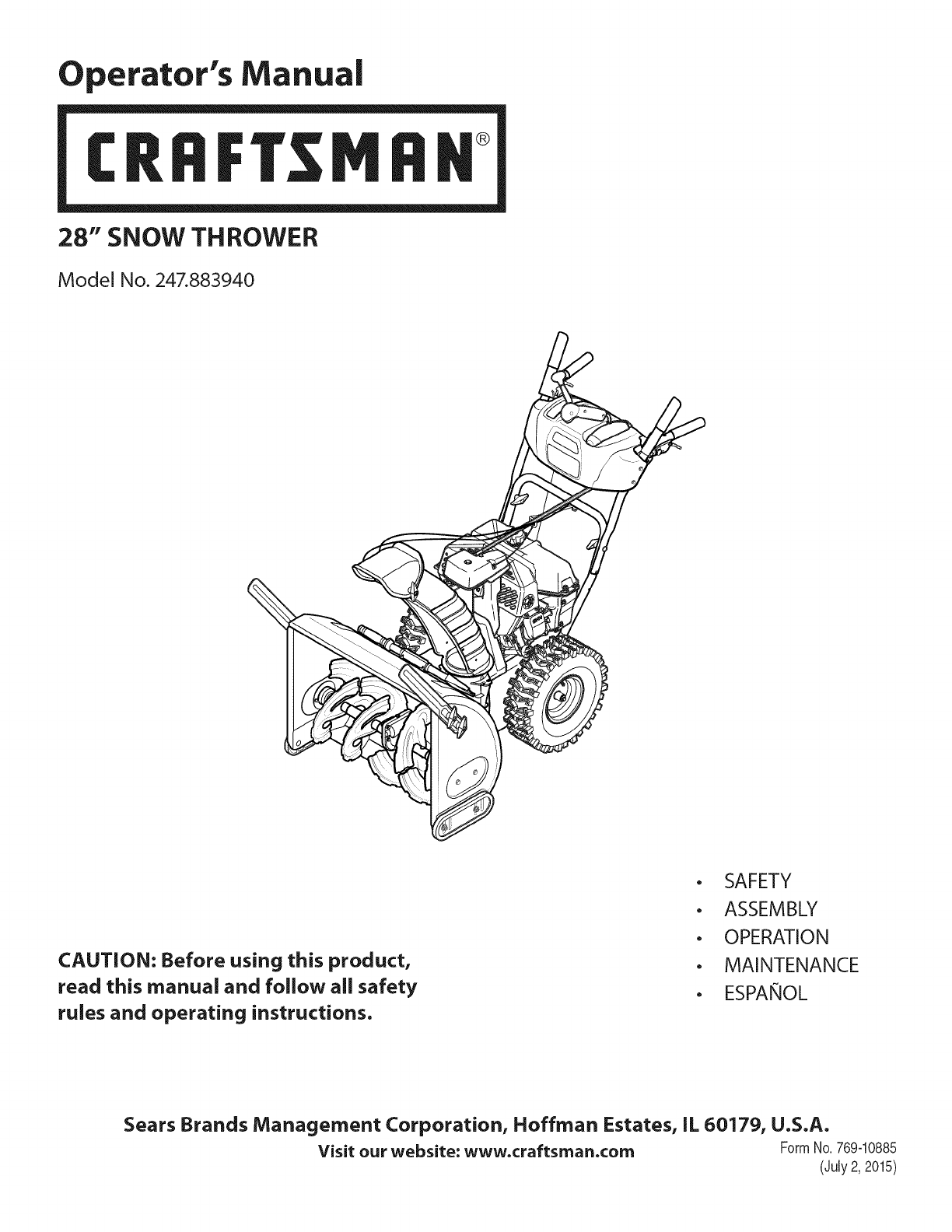 User Manual: Craftsman 247883940 247883940 CRAFTSMAN SNOW THROWER - Manuals and Guides View the owners manual for your CRAFTSMAN SNOW THROWER #247883940. Home:Lawn & Garden Parts:Craftsman Parts:Craftsman SNOW THROWER Manual