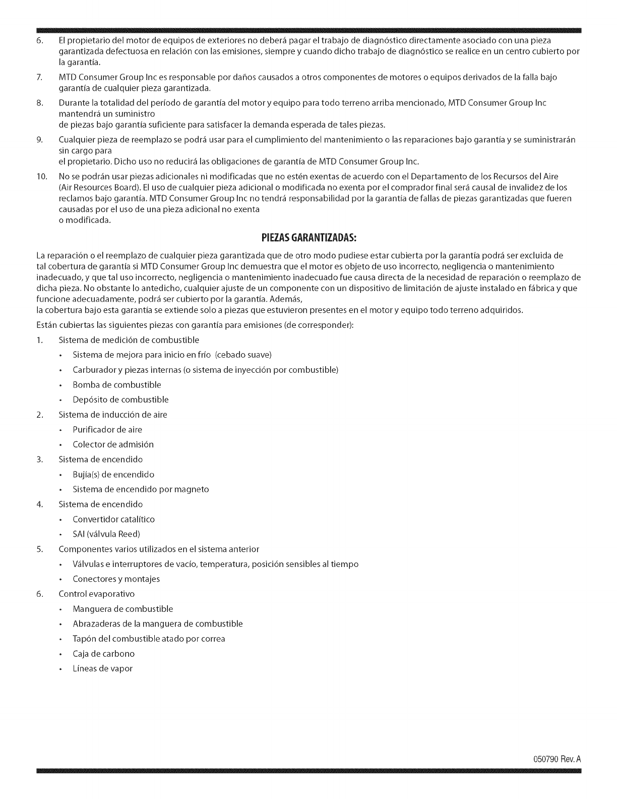 tal cobertura de garantia si MTD Consumer Group Inc demuestra que el motor es objeto de uso incorrecto, negligencia o mantenimiento