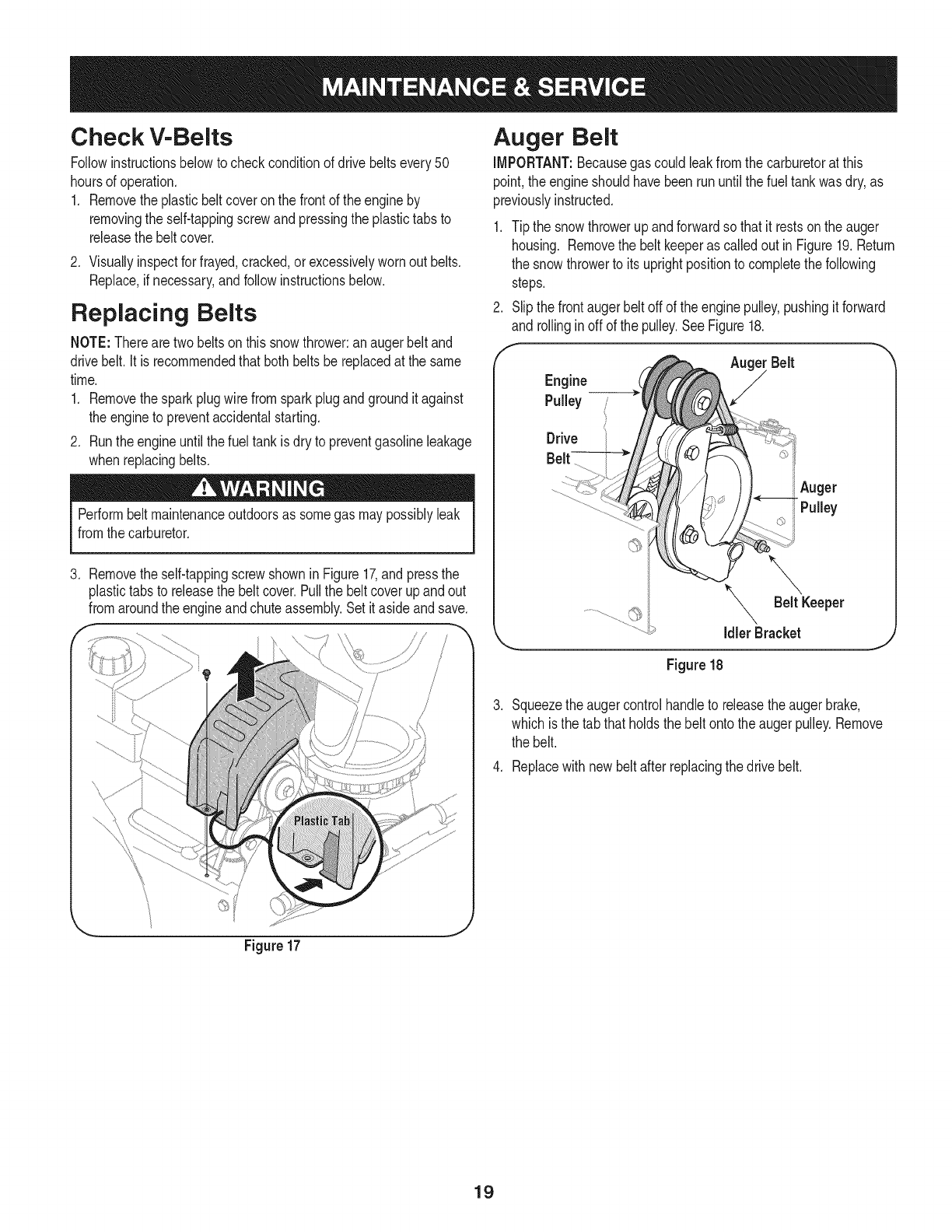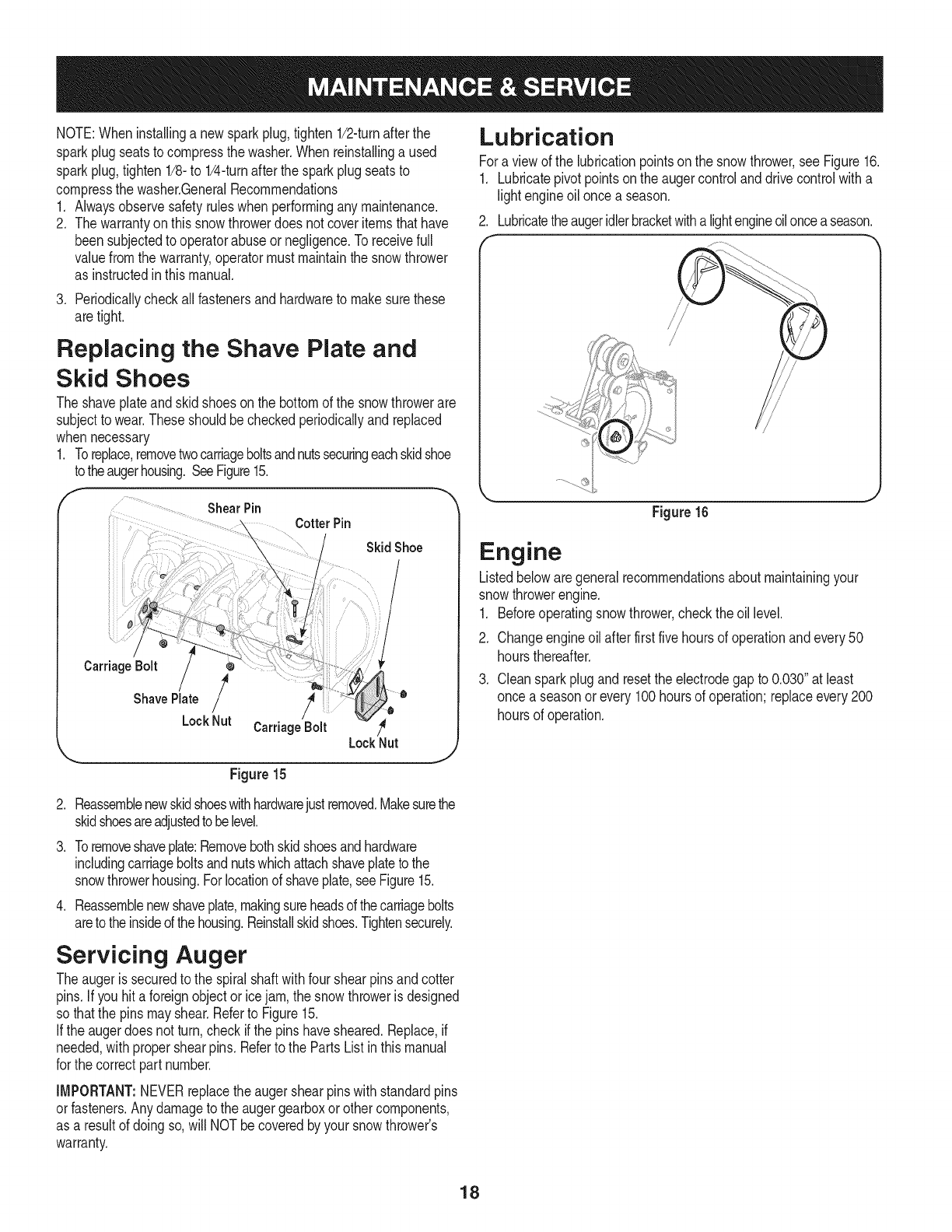 augerbladesor paddles,skidshoes,shaveplate,shearpins,sparkplug,air cleaner,belts,andoilfilter.