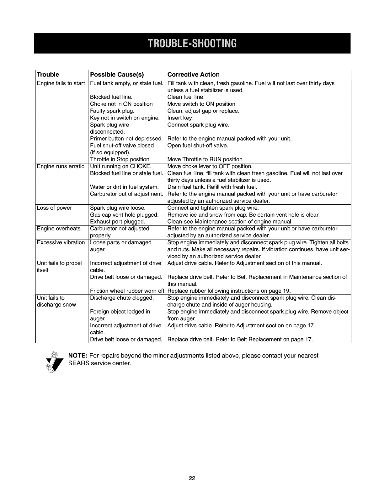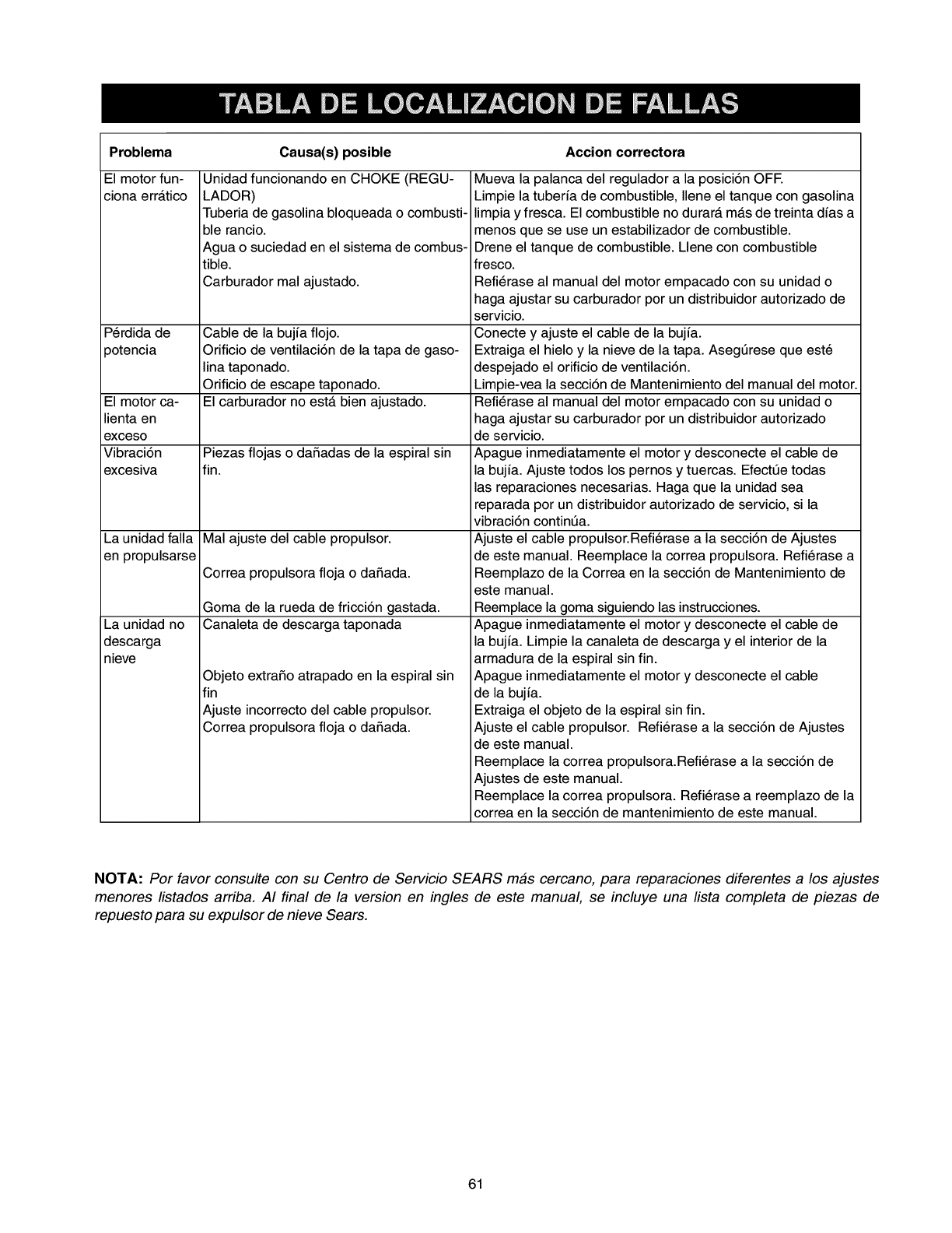 NOTA: Por favor consulte con su Centro de Servicio SEARS mas cercano, para reparaciones diferentes a los ajustes