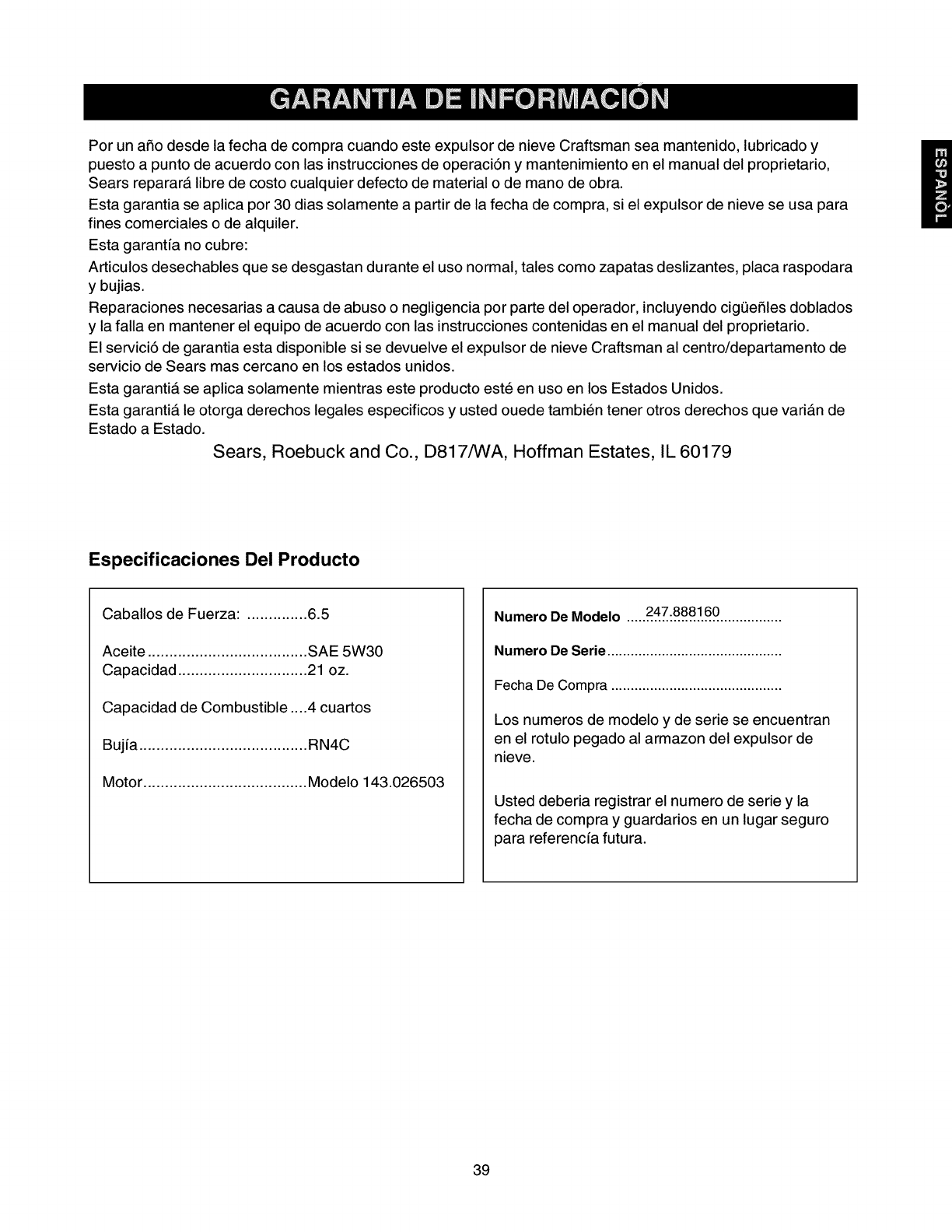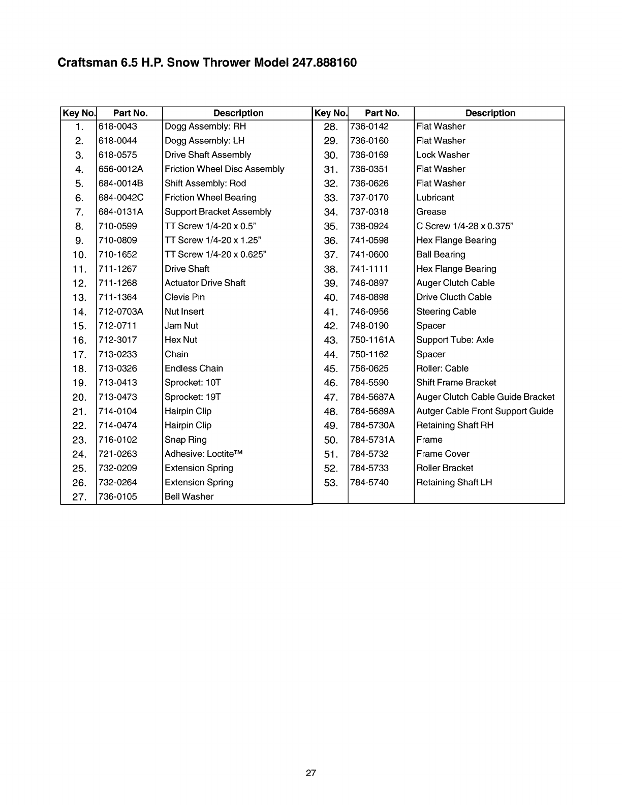 User Manual: Craftsman 247888160 247888160 CRAFTSMAN SNOW THROWER - Manuals and Guides View the owners manual for your CRAFTSMAN SNOW THROWER #247888160. Home:Lawn & Garden Parts:Craftsman Parts:Craftsman SNOW THROWER Manual