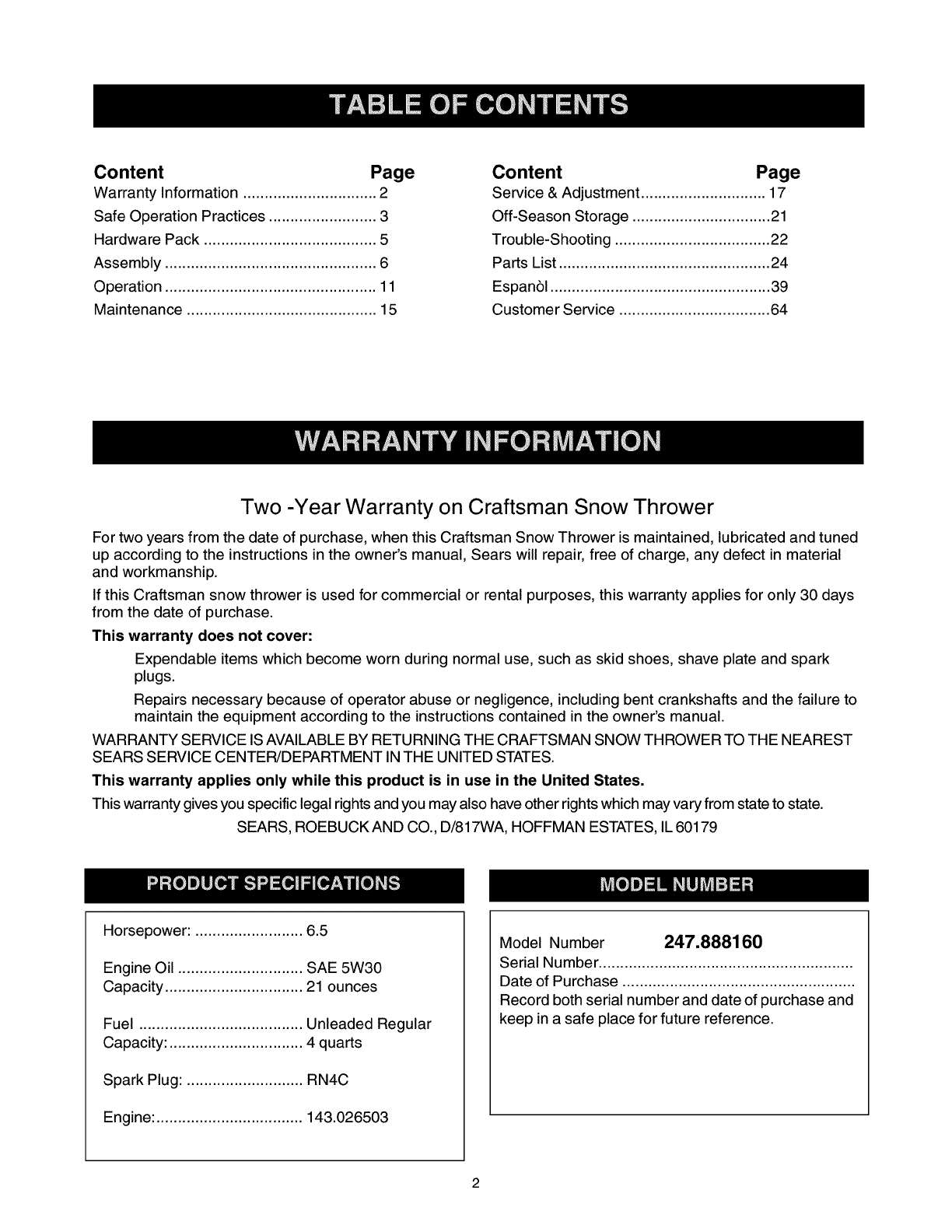 Two -Year Warranty on Craftsman Snow Thrower