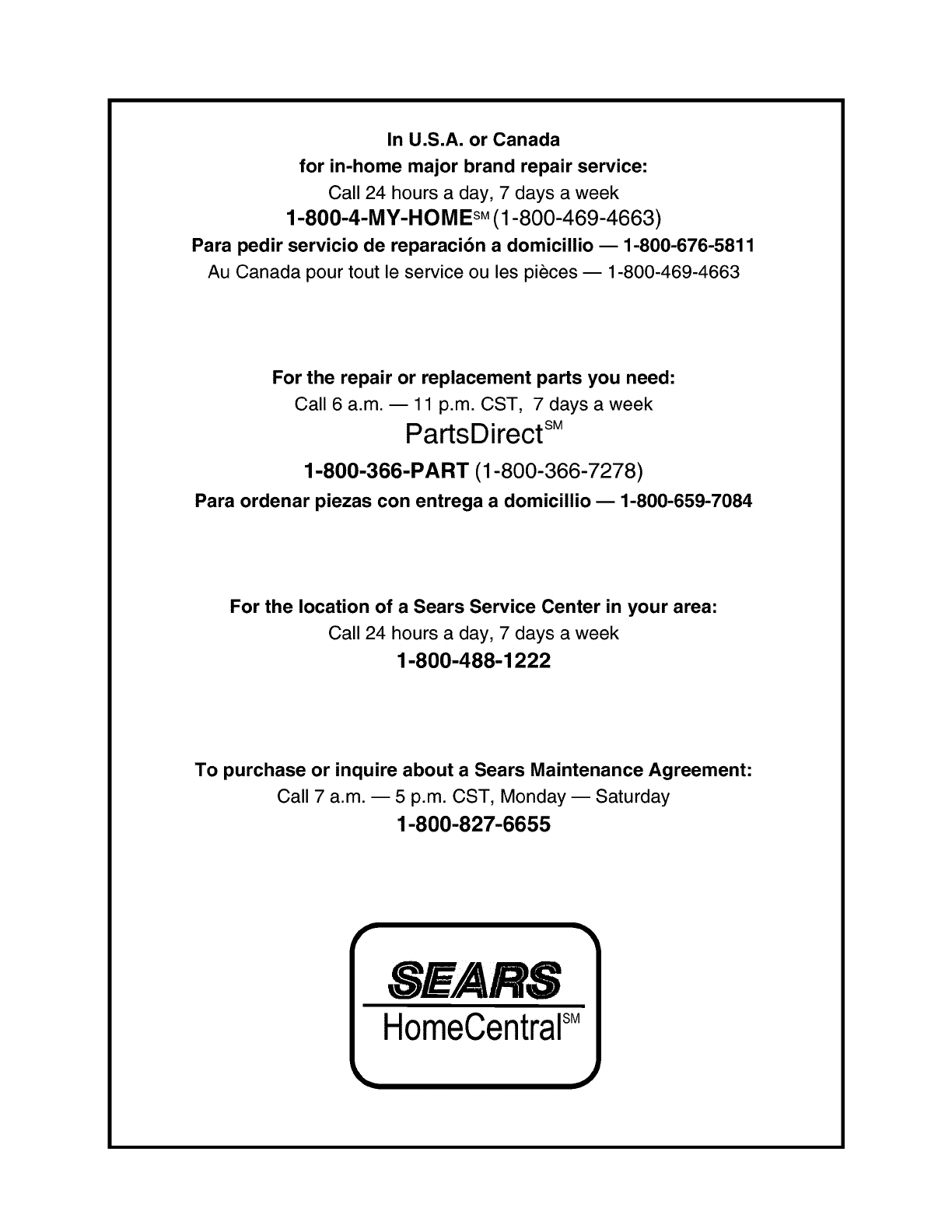 To purchase or inquire about a Sears Maintenance Agreement: