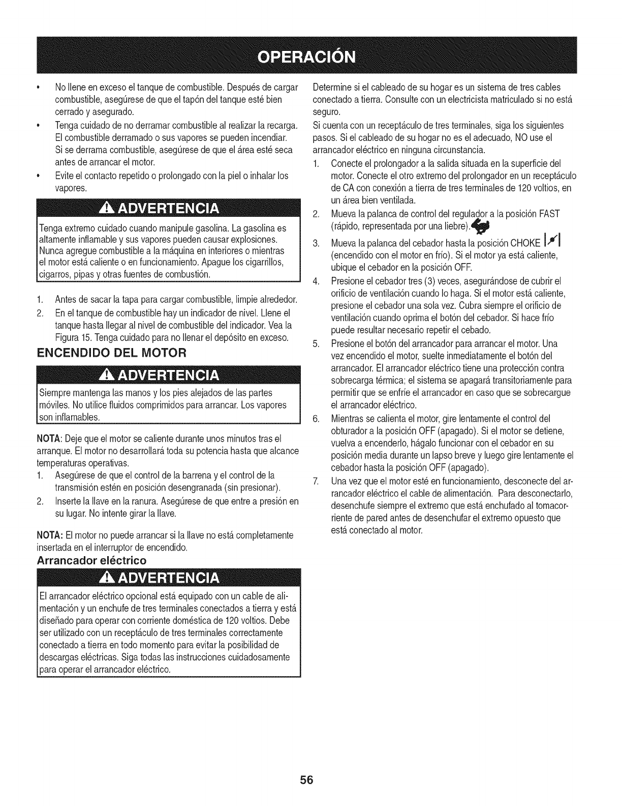 Para los motores con desplazamiento inferior a 225 cc, Categoria C = 125 horas, B = 250 horas y A = 500 horas.