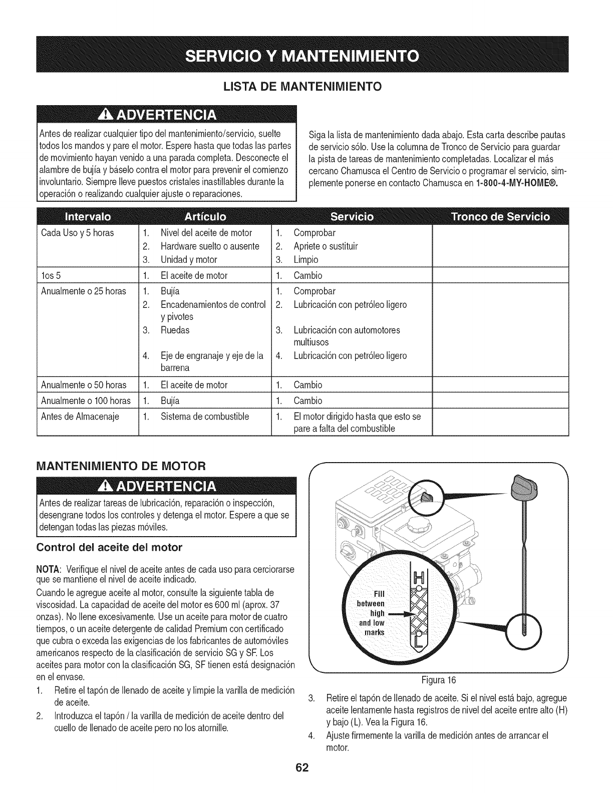 Para los motores con desplazamiento de 225 cc o mAs, Categoria C = 250 horas, B = 500 horas y A = 1000 horas.
