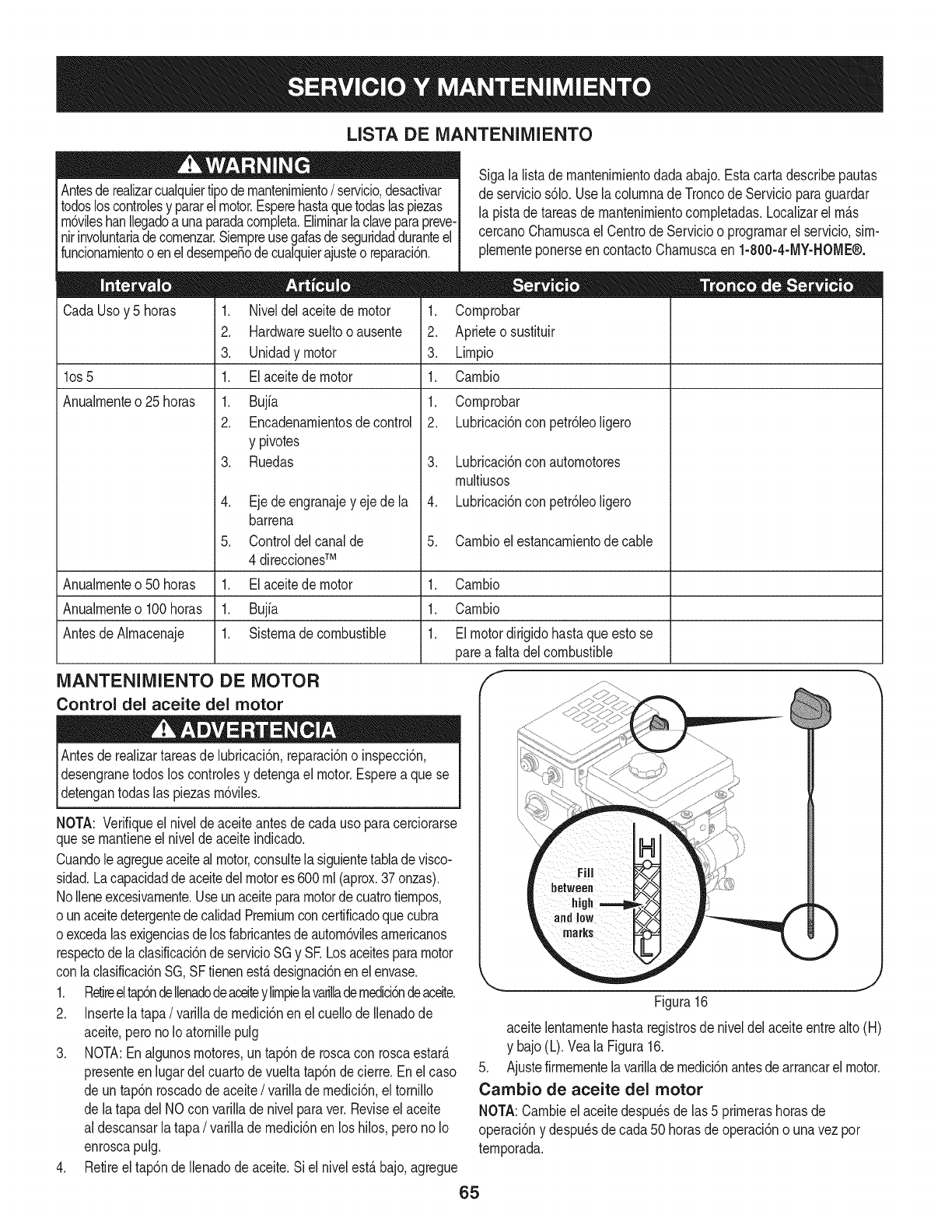 Para los motores con desplazamiento de 225 cc o mAs, Categoria C = 250 horas, B = 500 horas y A = 1000 horas.