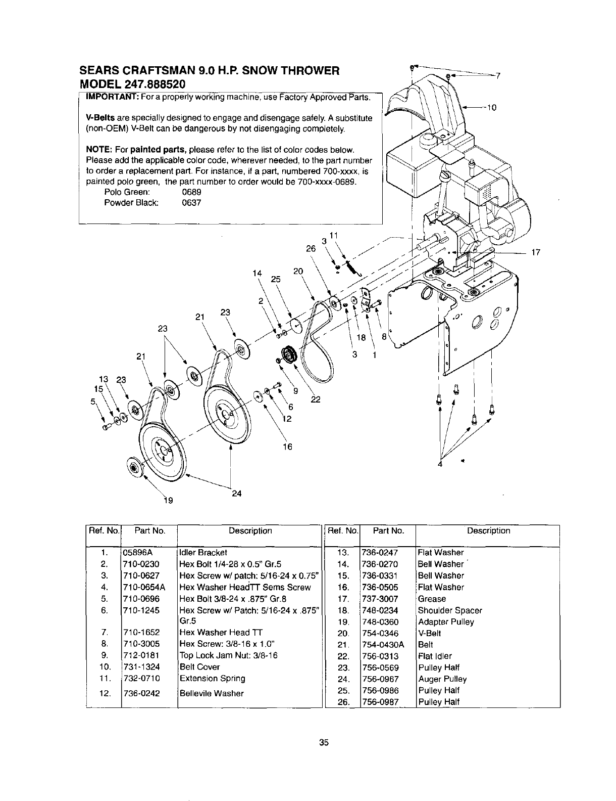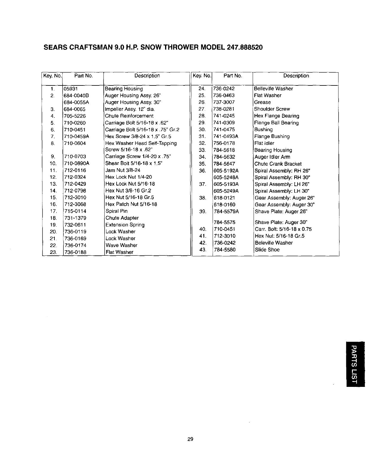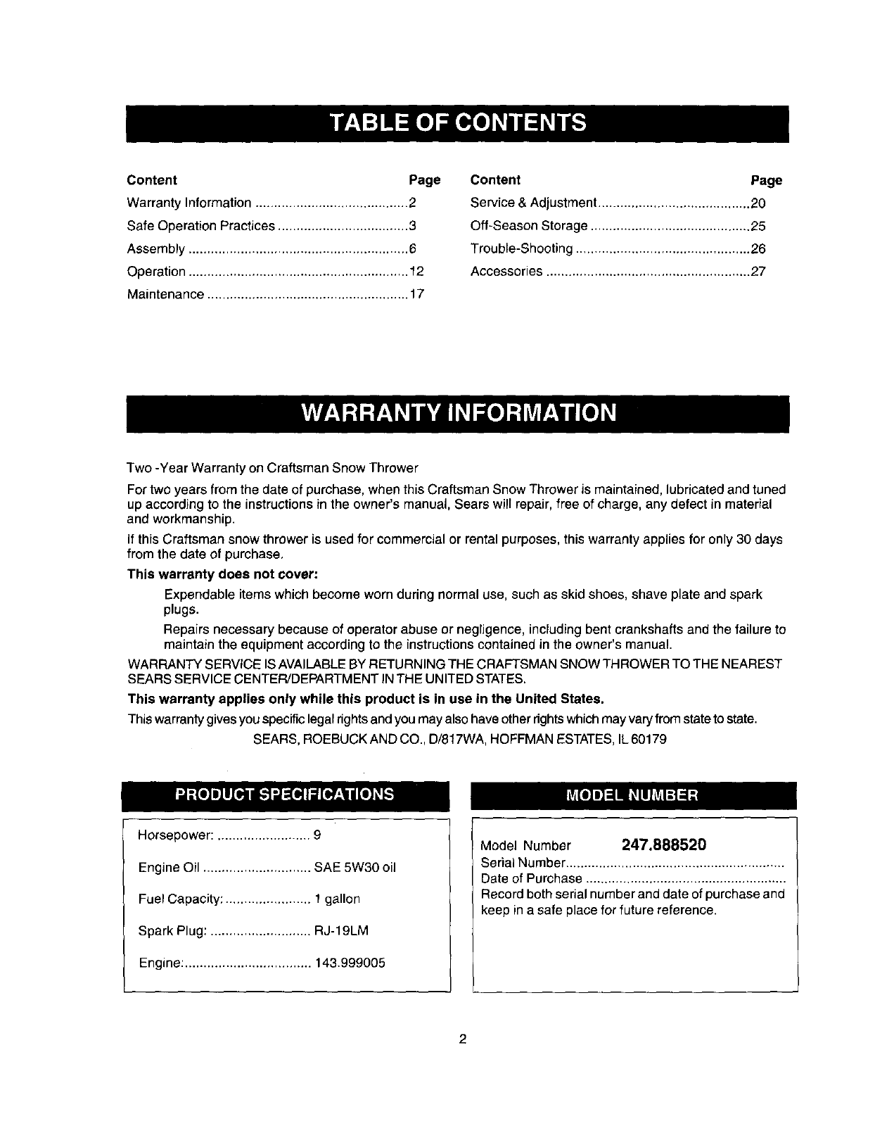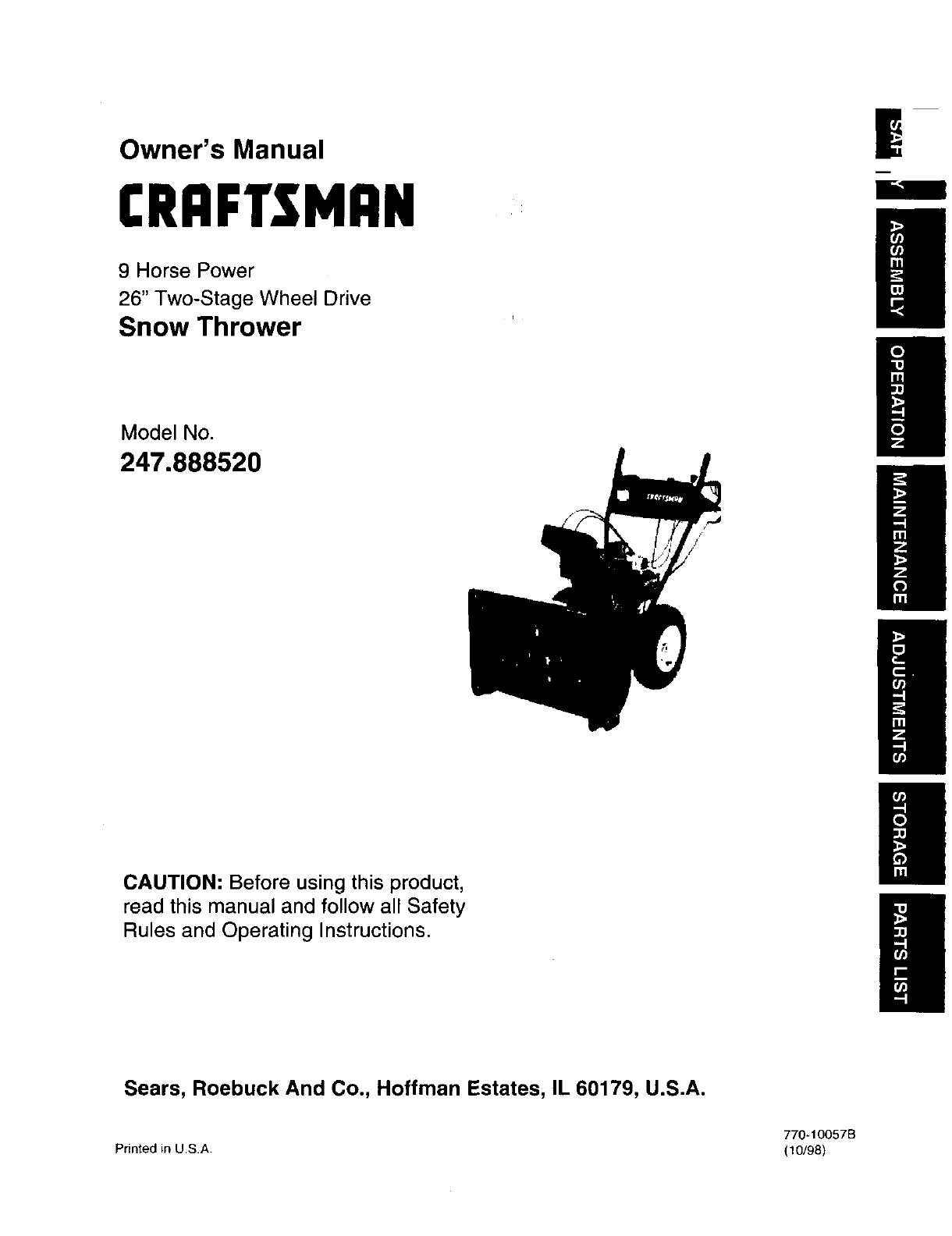 User Manual: Craftsman 247888520 247888520 CRAFTSMAN SNOW THROWER - Manuals and Guides View the owners manual for your CRAFTSMAN SNOW THROWER #247888520. Home:Lawn & Garden Parts:Craftsman Parts:Craftsman SNOW THROWER Manual