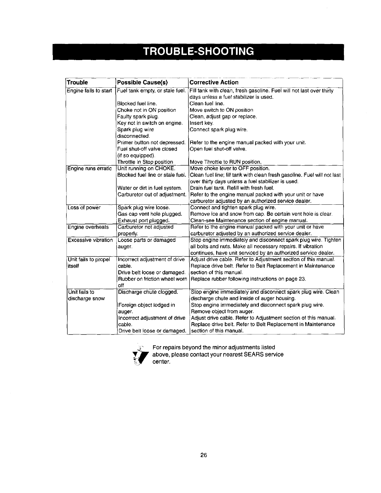 up according to the instructions in the owner's manual, Sears will repair, free of charge, any defect in material