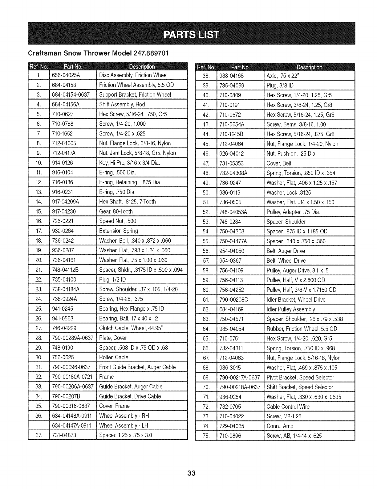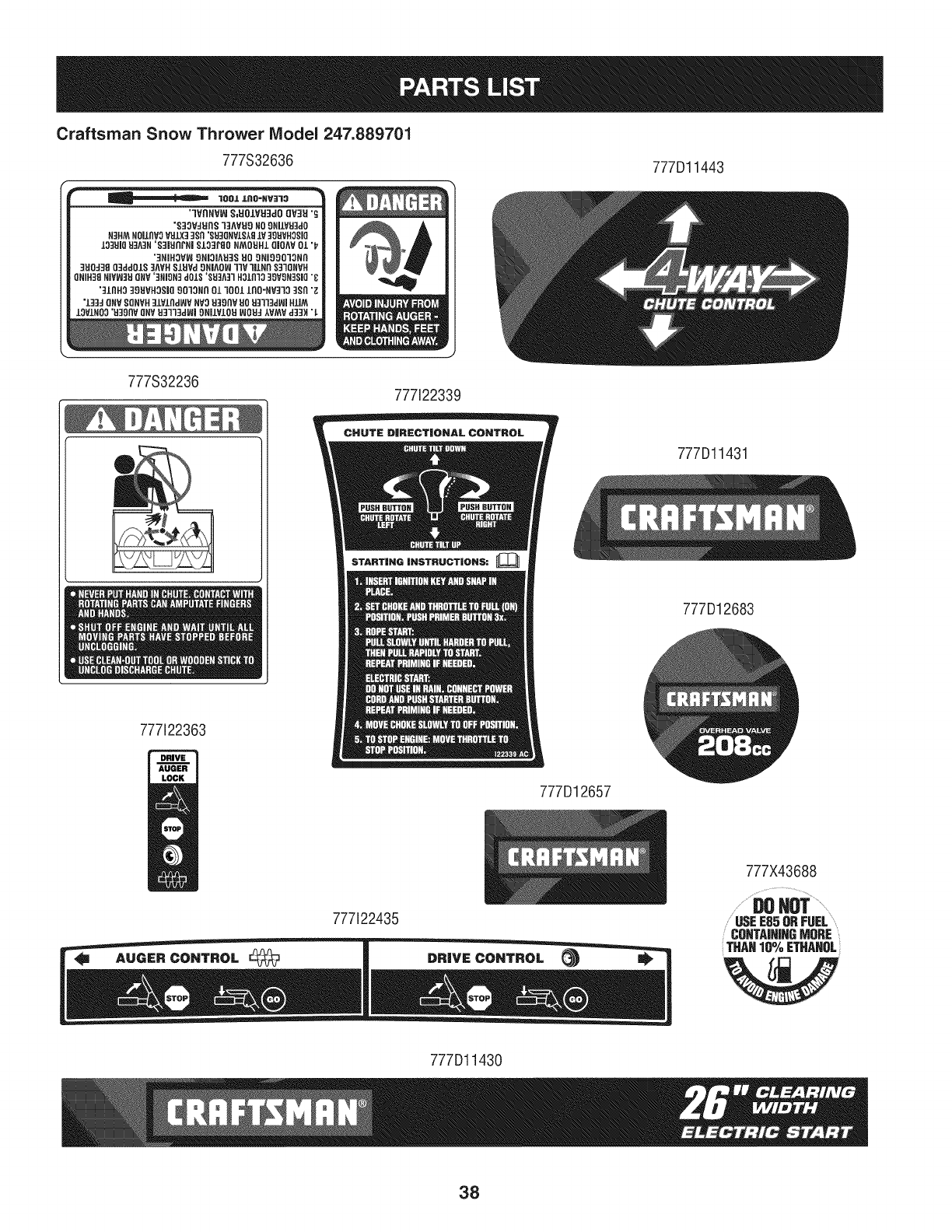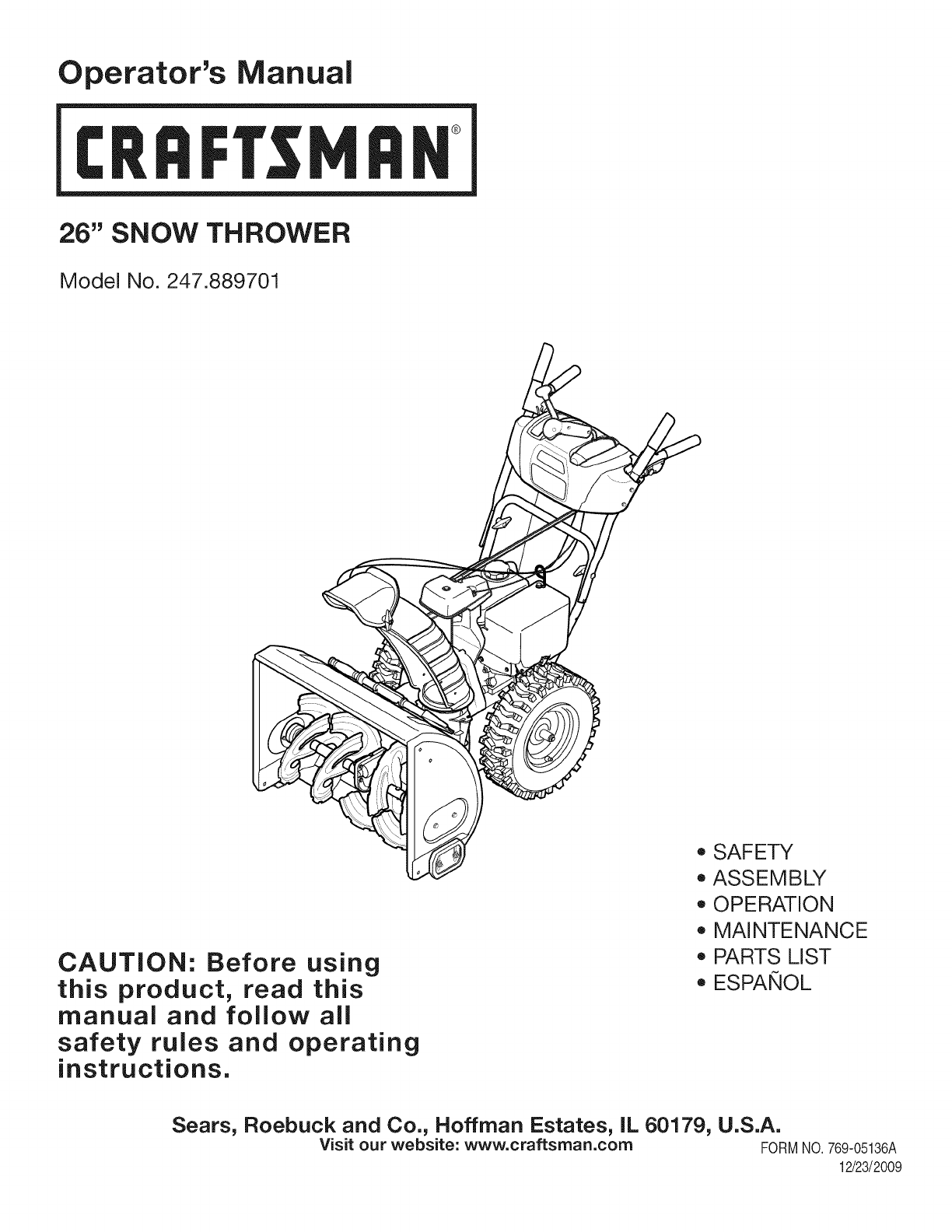 User Manual: Craftsman 247889701 247889701 CRAFTSMAN SNOW THROWER - Manuals and Guides View the owners manual for your CRAFTSMAN SNOW THROWER #247889701. Home:Lawn & Garden Parts:Craftsman Parts:Craftsman SNOW THROWER Manual