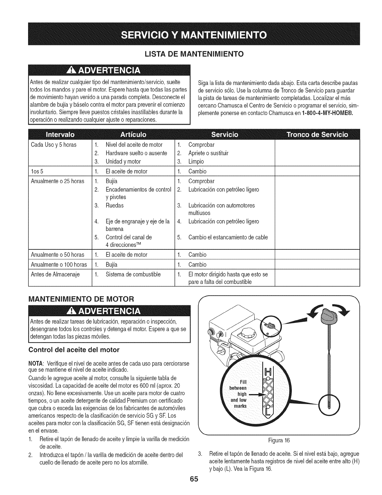 Para los motores con desplazamiento de 225 cc o mAs, Categoria C = 250 horas, B = 500 horas y A = 1000 horas.