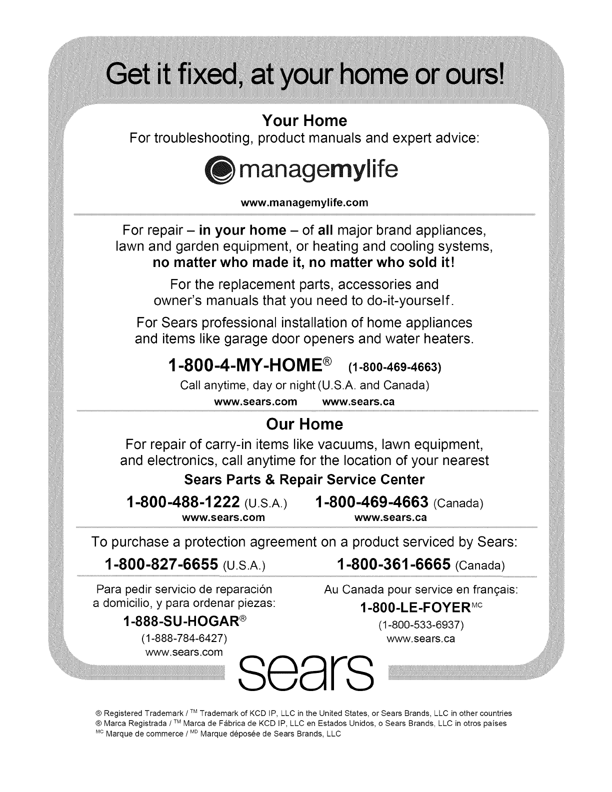 ® Registered Trademark /TMTrademark of KCD IP, LLC in the United States, or Sears Brands, LLC in other countries