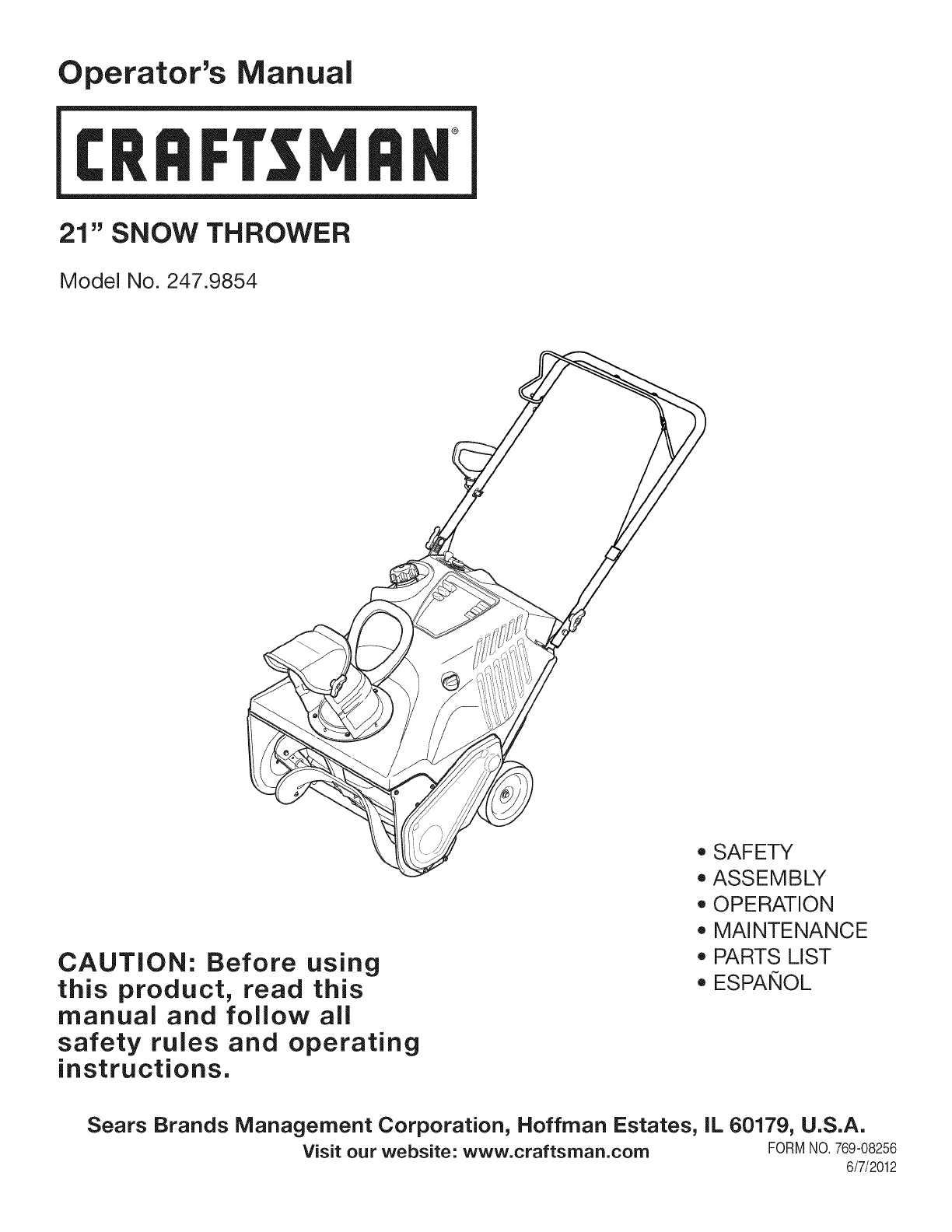 Craftsman 2479854 User Manual SNOW THROWER Manuals And Guides 1206514L