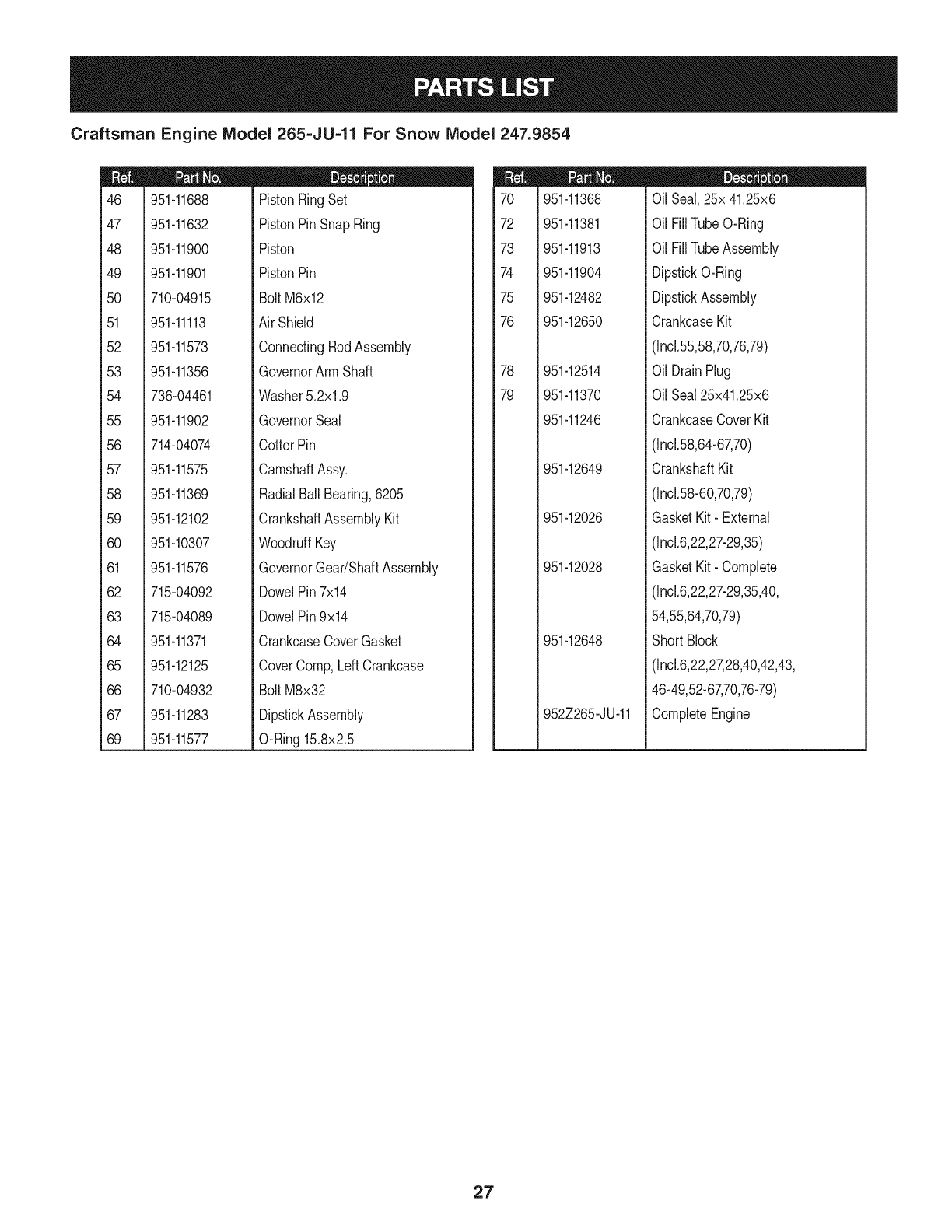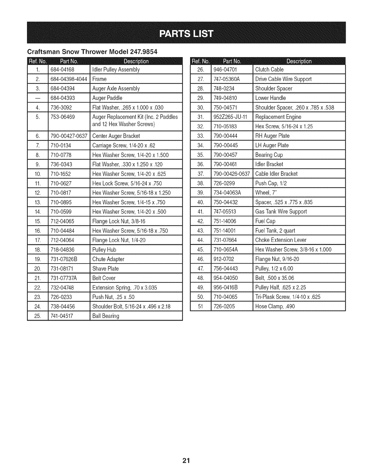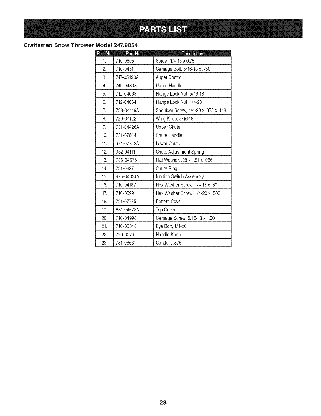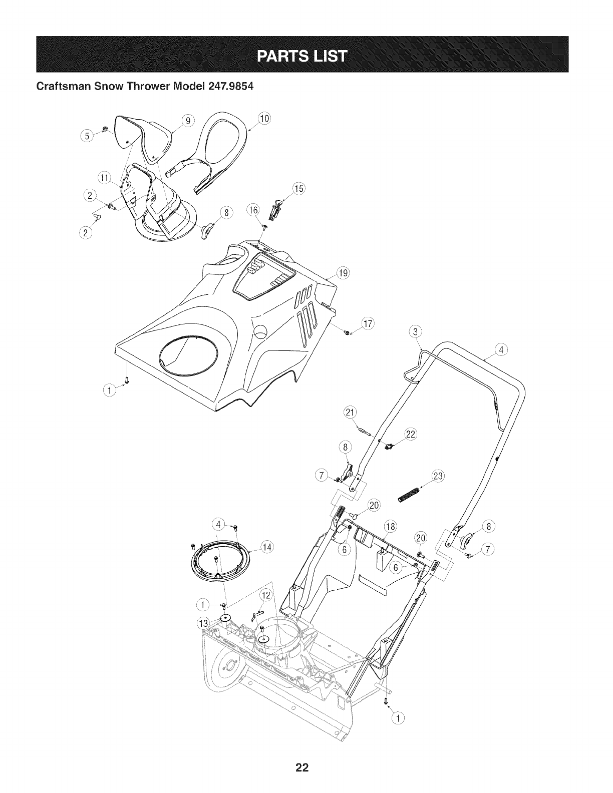 User Manual: Craftsman 2479854 2479854 CRAFTSMAN SNOW THROWER - Manuals and Guides View the owners manual for your CRAFTSMAN SNOW THROWER #2479854. Home:Lawn & Garden Parts:Craftsman Parts:Craftsman SNOW THROWER Manual