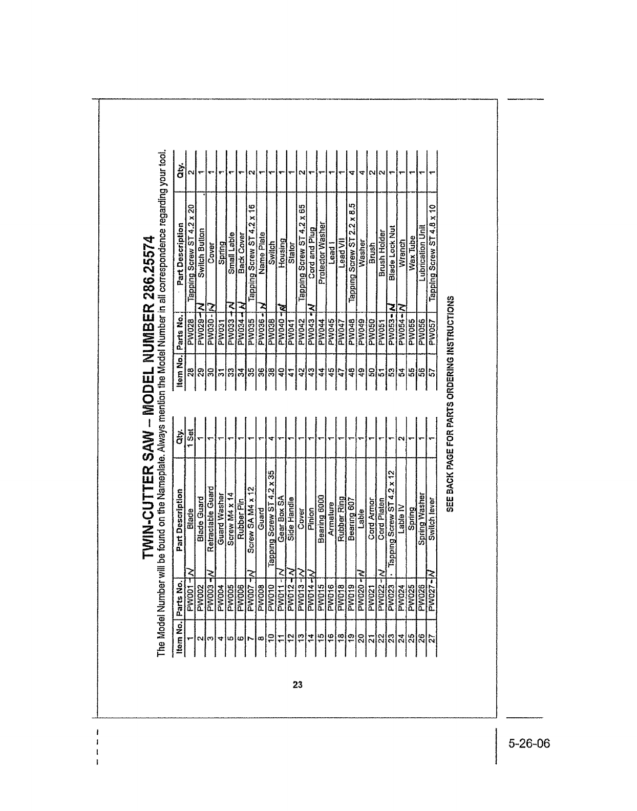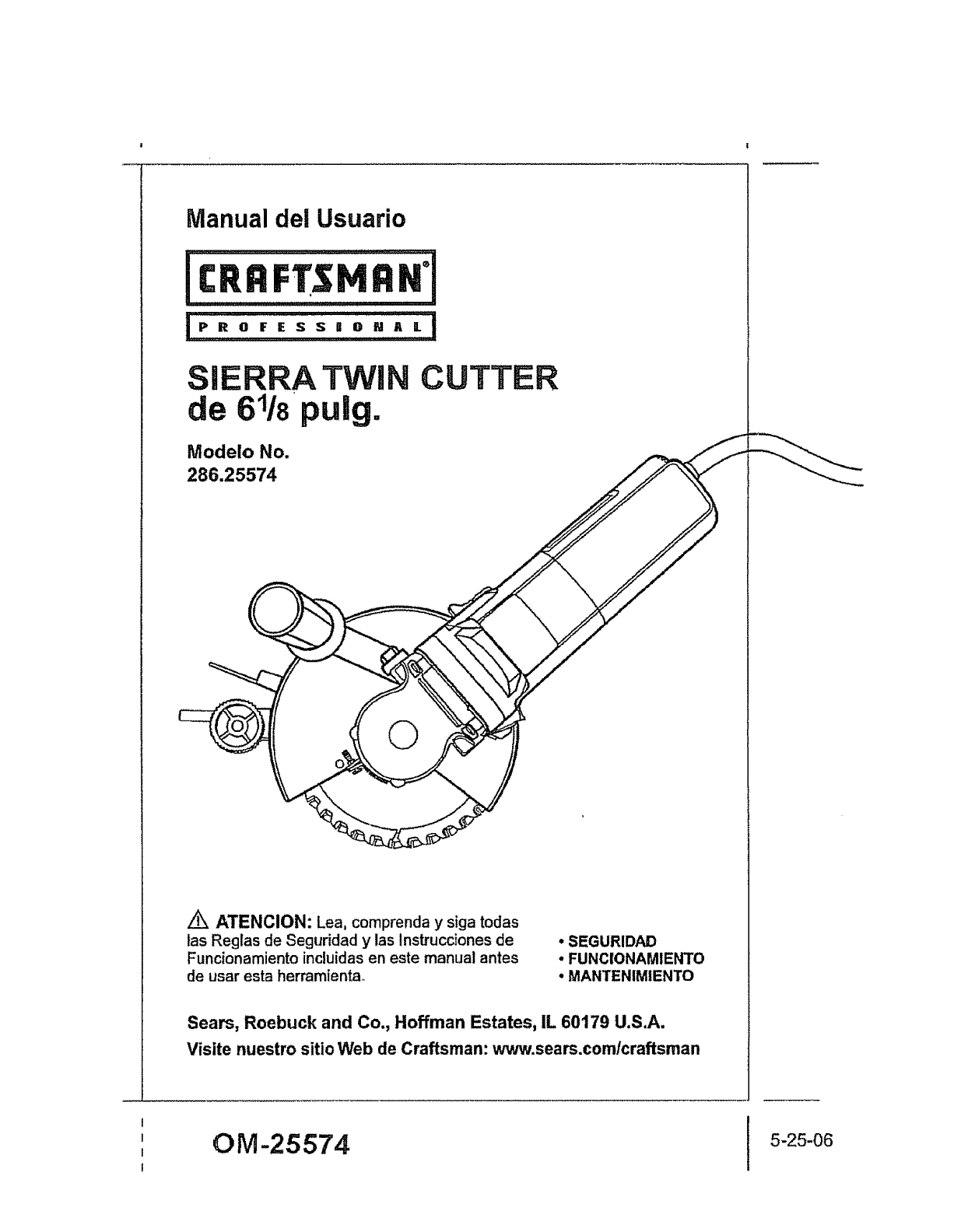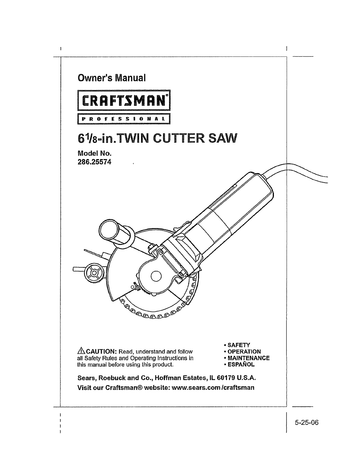 User Manual: Craftsman 28625574 28625574 CRAFTSMAN SAW - Manuals and Guides View the owners manual for your CRAFTSMAN SAW #28625574. Home:Tool Parts:Craftsman Parts:Craftsman SAW Manual