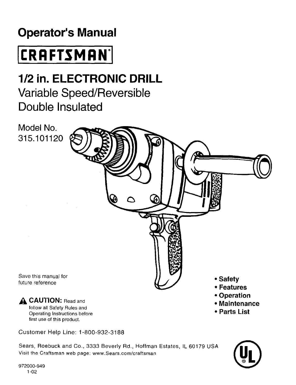 User Manual: Craftsman 315101120 315101120 CRAFTSMAN ELECTRONIC DRILL - Manuals and Guides View the owners manual for your CRAFTSMAN ELECTRONIC DRILL #315101120. Home:Tool Parts:Craftsman Parts:Craftsman ELECTRONIC DRILL Manual