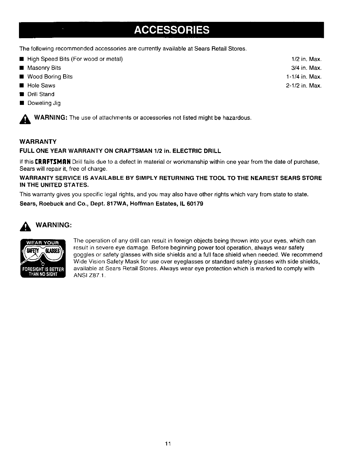 available at Sears Retail Stores. Always wear eye protection which is marked to comply with