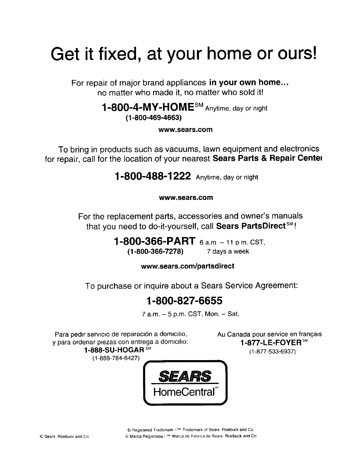 for repair, call for the location of your nearest Sears Parts & Repair Cente=