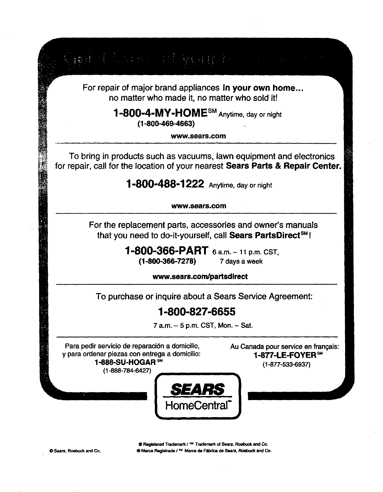 for repair, call for the location of your nearest Sears Parts &Repair Center