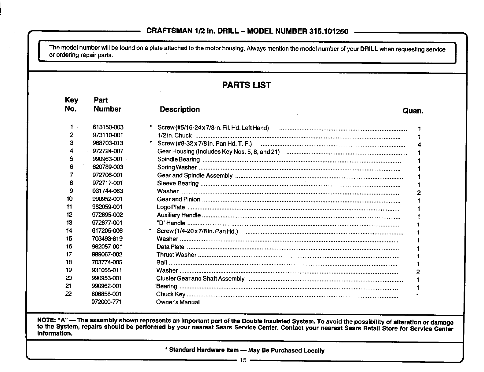 CRAFTSMAN 1/2 In. DRILL - MODEL NUMBER 315.101250