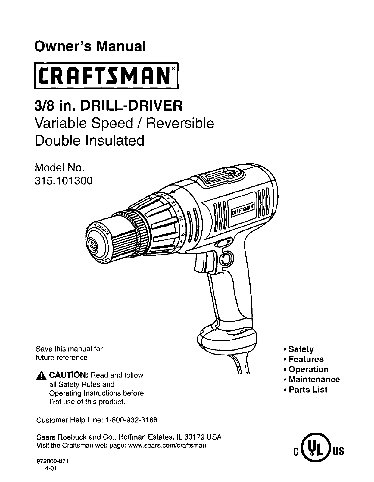 User Manual: Craftsman 315101300 315101300 CRAFTSMAN DRILL DRIVER - Manuals and Guides View the owners manual for your CRAFTSMAN DRILL DRIVER #315101300. Home:Tool Parts:Craftsman Parts:Craftsman DRILL DRIVER Manual