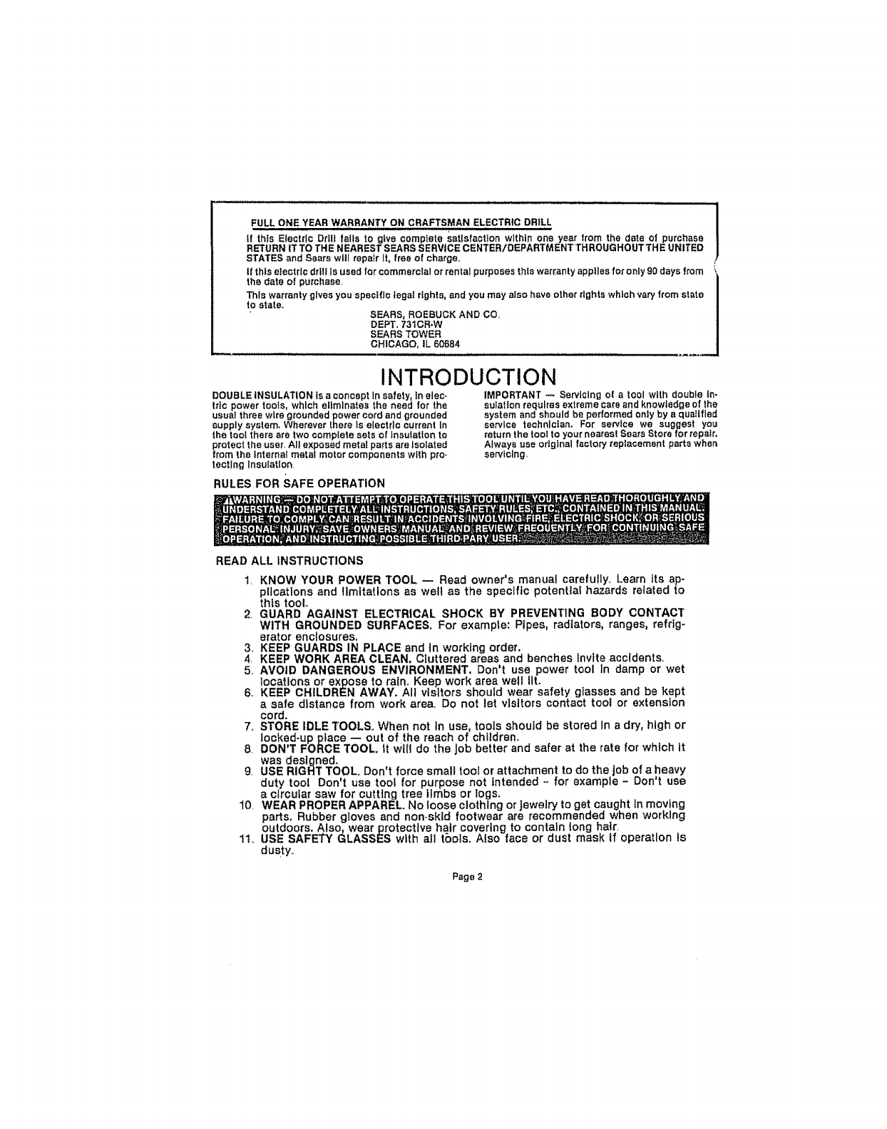 FULL ONE YEAR WARRANTY ON CRAFTSMAN ELECTRIC DRILL