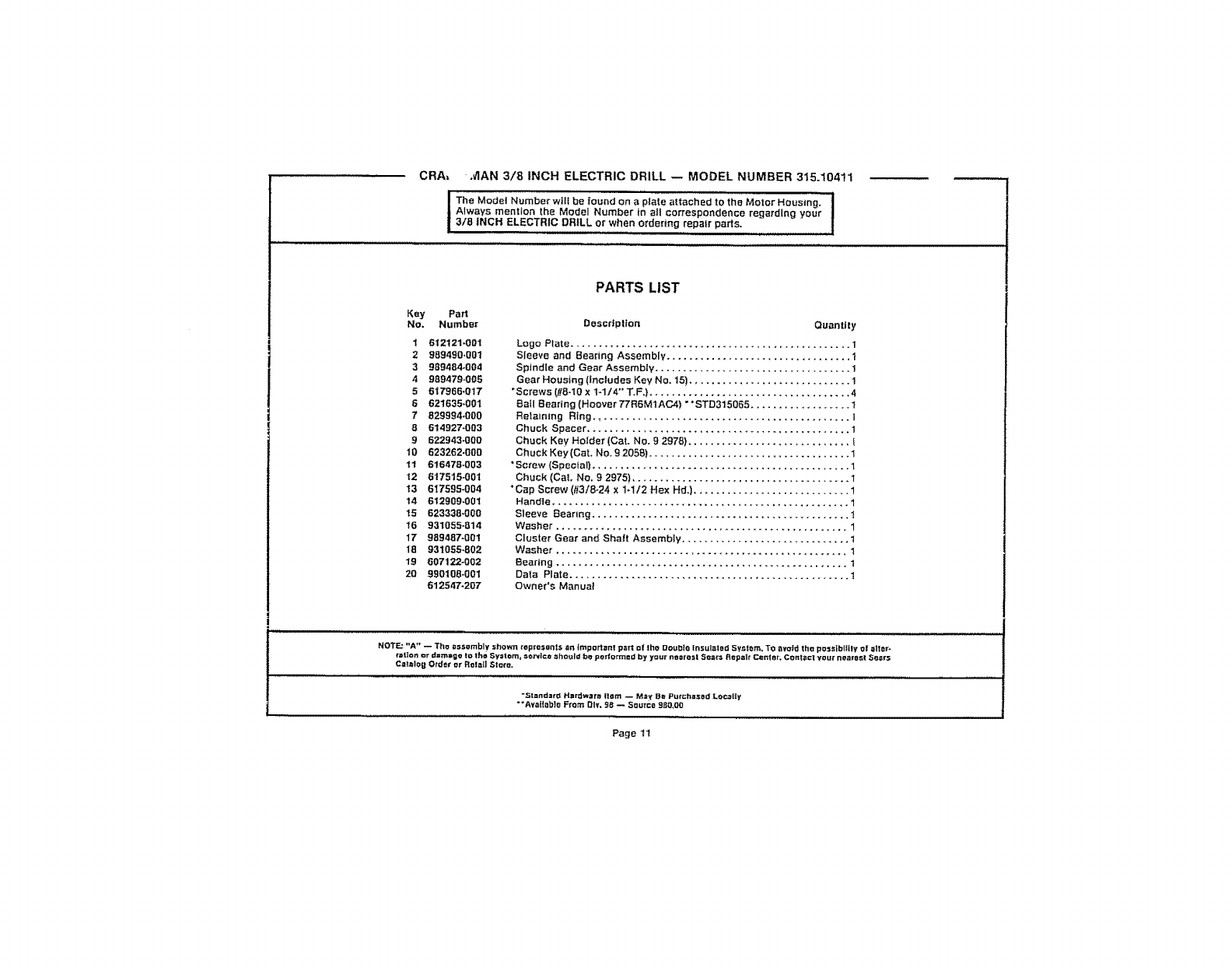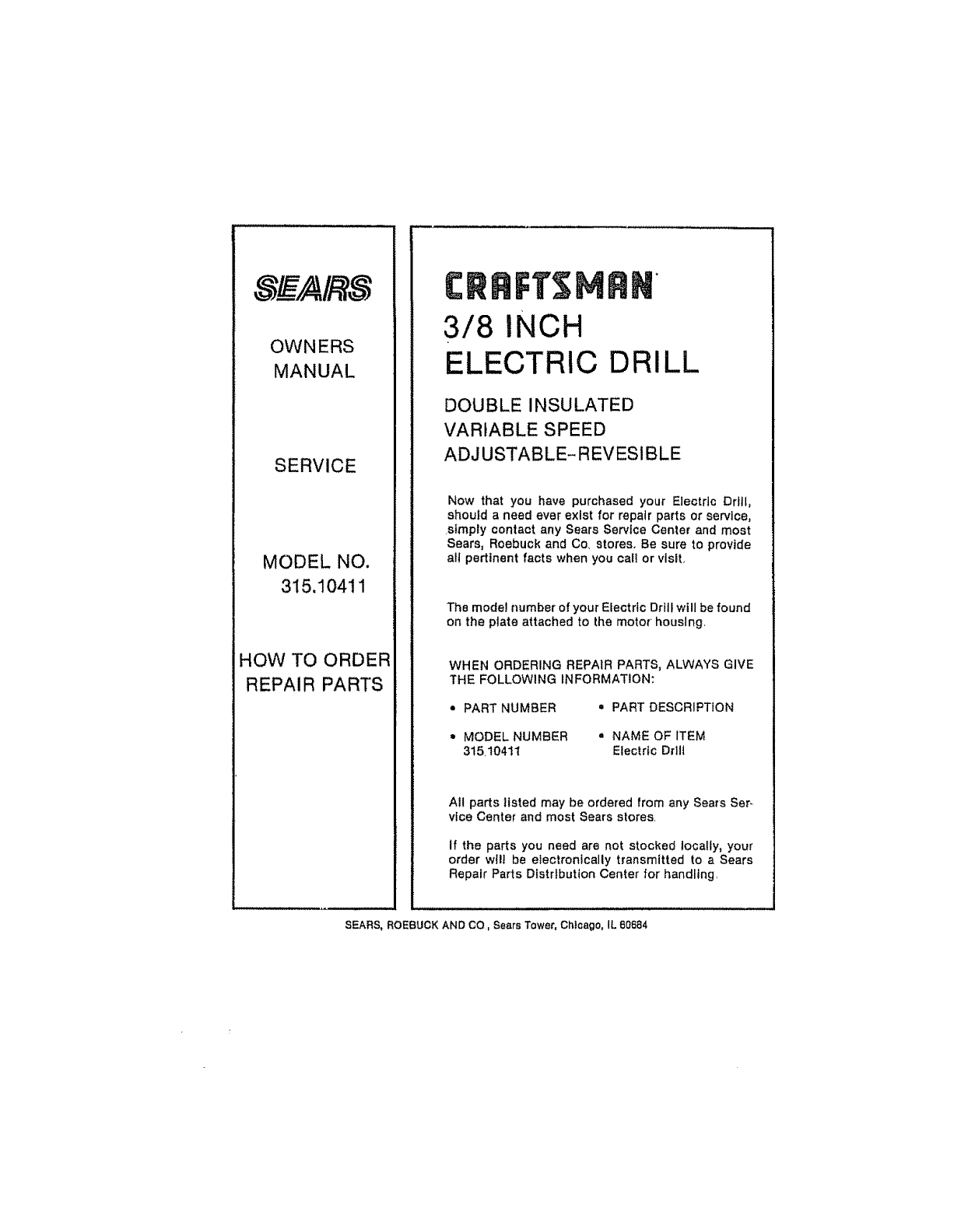 User Manual: Craftsman 31510411 31510411 CRAFTSMAN CRAFTSMAN 3/8 INCH ELECTRIC DRILL - Manuals and Guides View the owners manual for your CRAFTSMAN CRAFTSMAN 3/8 INCH ELECTRIC DRILL #31510411. Home:Tool Parts:Craftsman Parts:Craftsman CRAFTSMAN 3/8 INCH ELECTRIC DRILL Manual