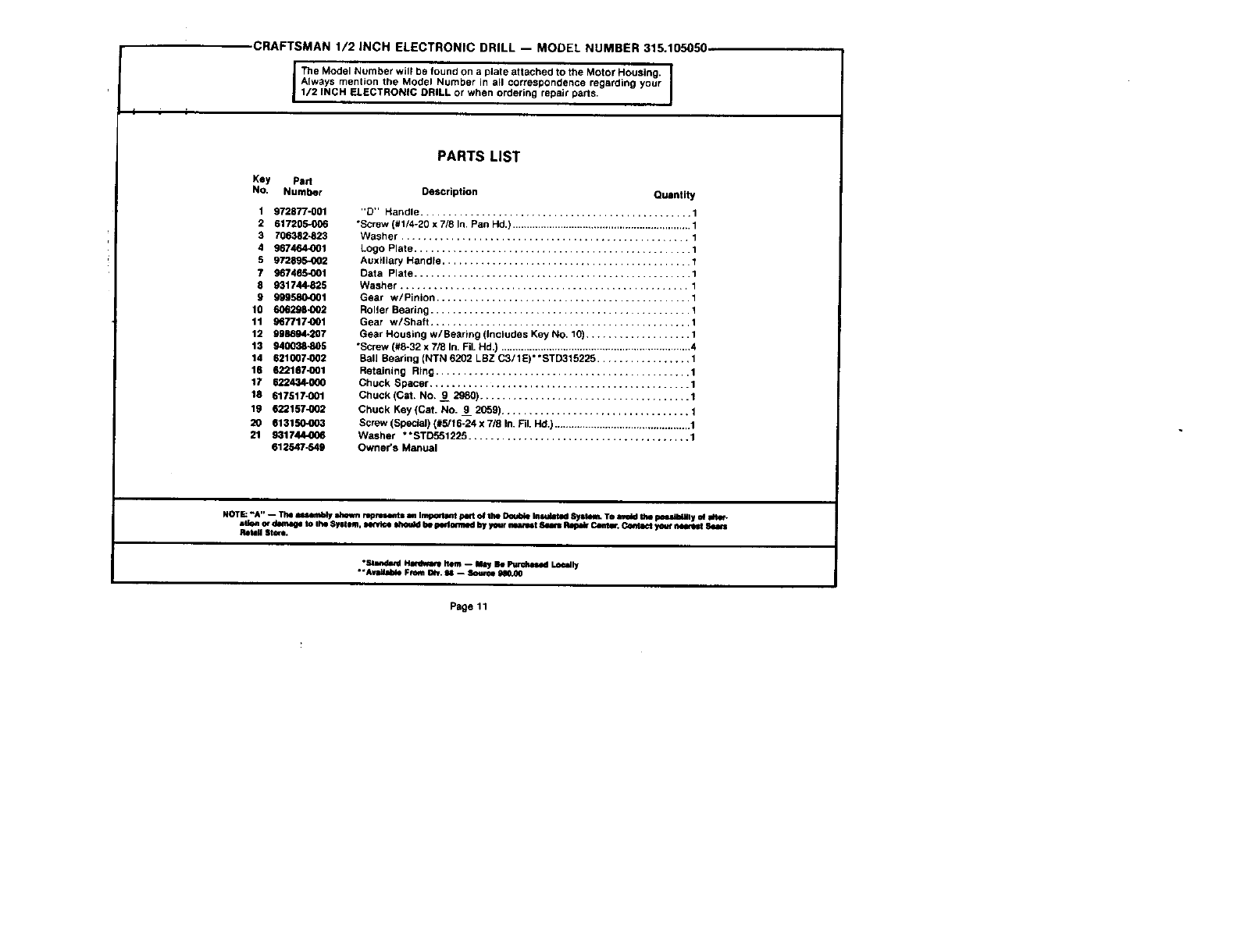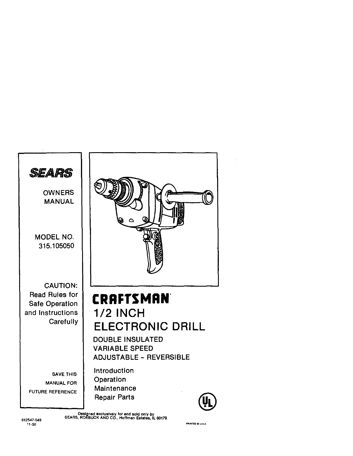 User Manual: Craftsman 315105050 315105050 CRAFTSMAN 1/2 ELECTRONIC DRILL - Manuals and Guides View the owners manual for your CRAFTSMAN 1/2 ELECTRONIC DRILL #315105050. Home:Tool Parts:Craftsman Parts:Craftsman 1/2 ELECTRONIC DRILL Manual