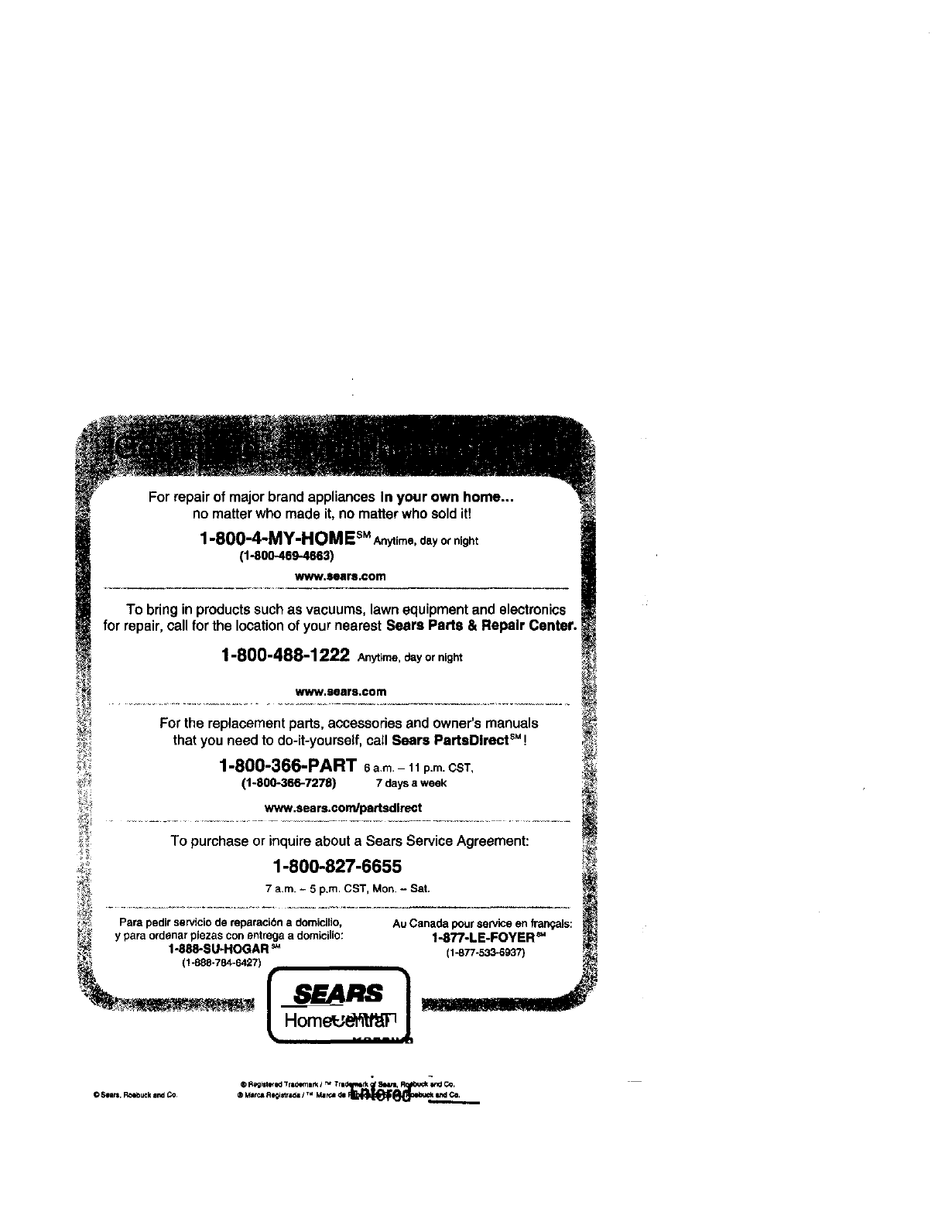 for repair,callfor the locationof yournearestSeers Parts & Repair Canter._