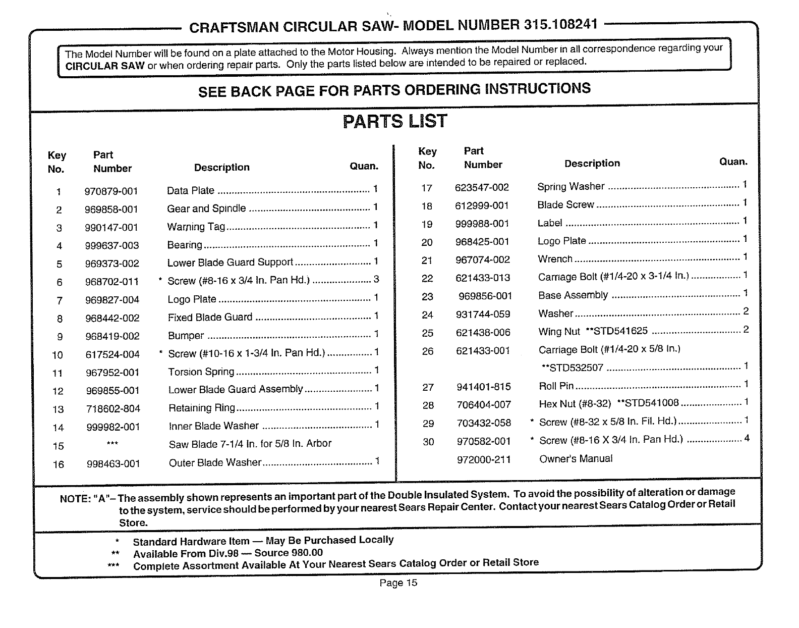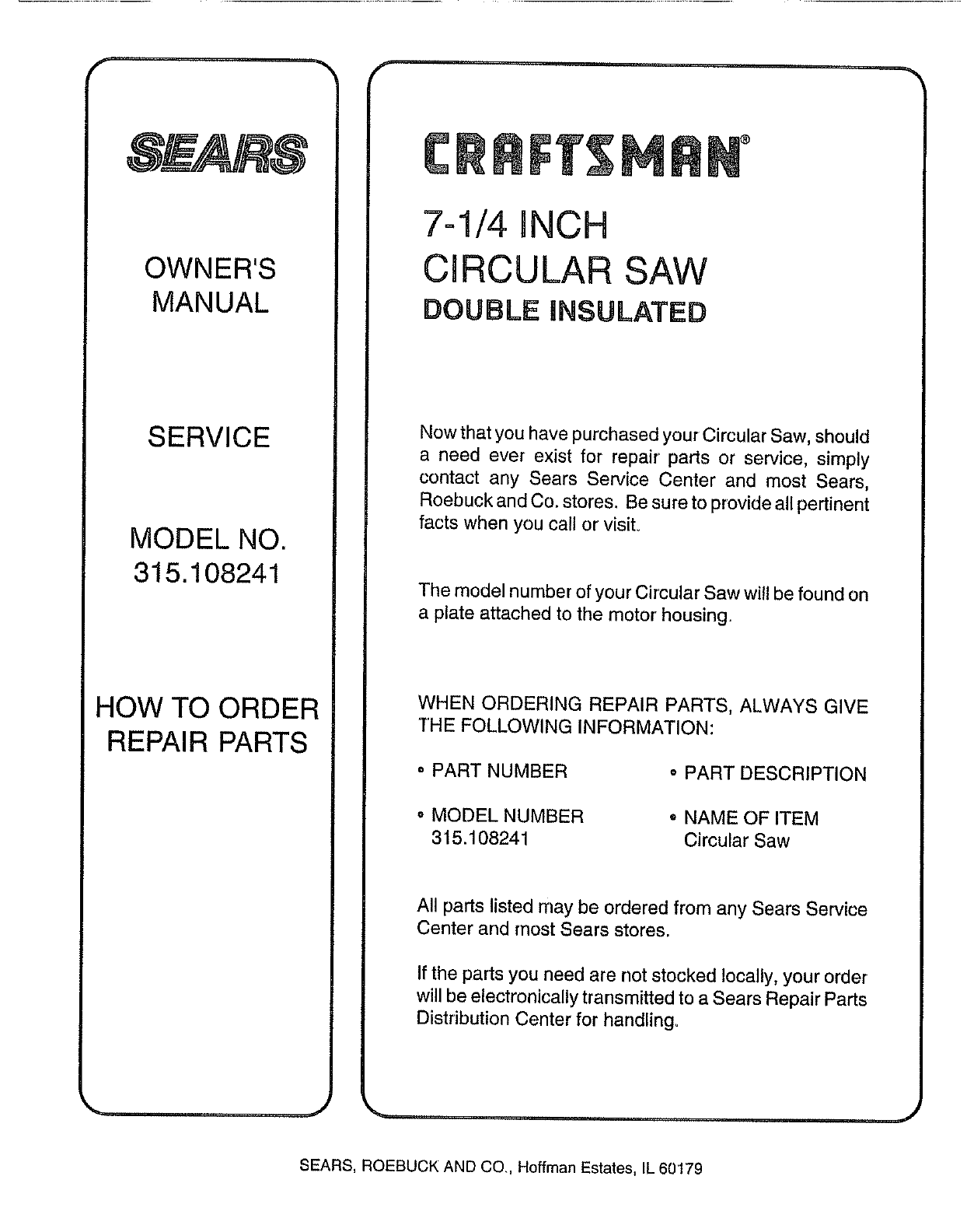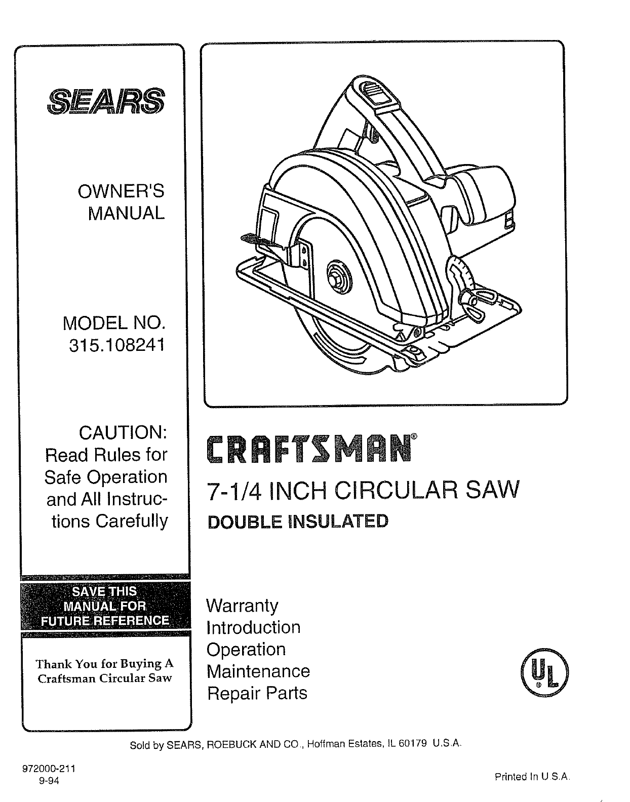 User Manual: Craftsman 315108241 315108241 CRAFTSMAN CIRCULAR SAW - Manuals and Guides View the owners manual for your CRAFTSMAN CIRCULAR SAW #315108241. Home:Tool Parts:Craftsman Parts:Craftsman CIRCULAR SAW Manual